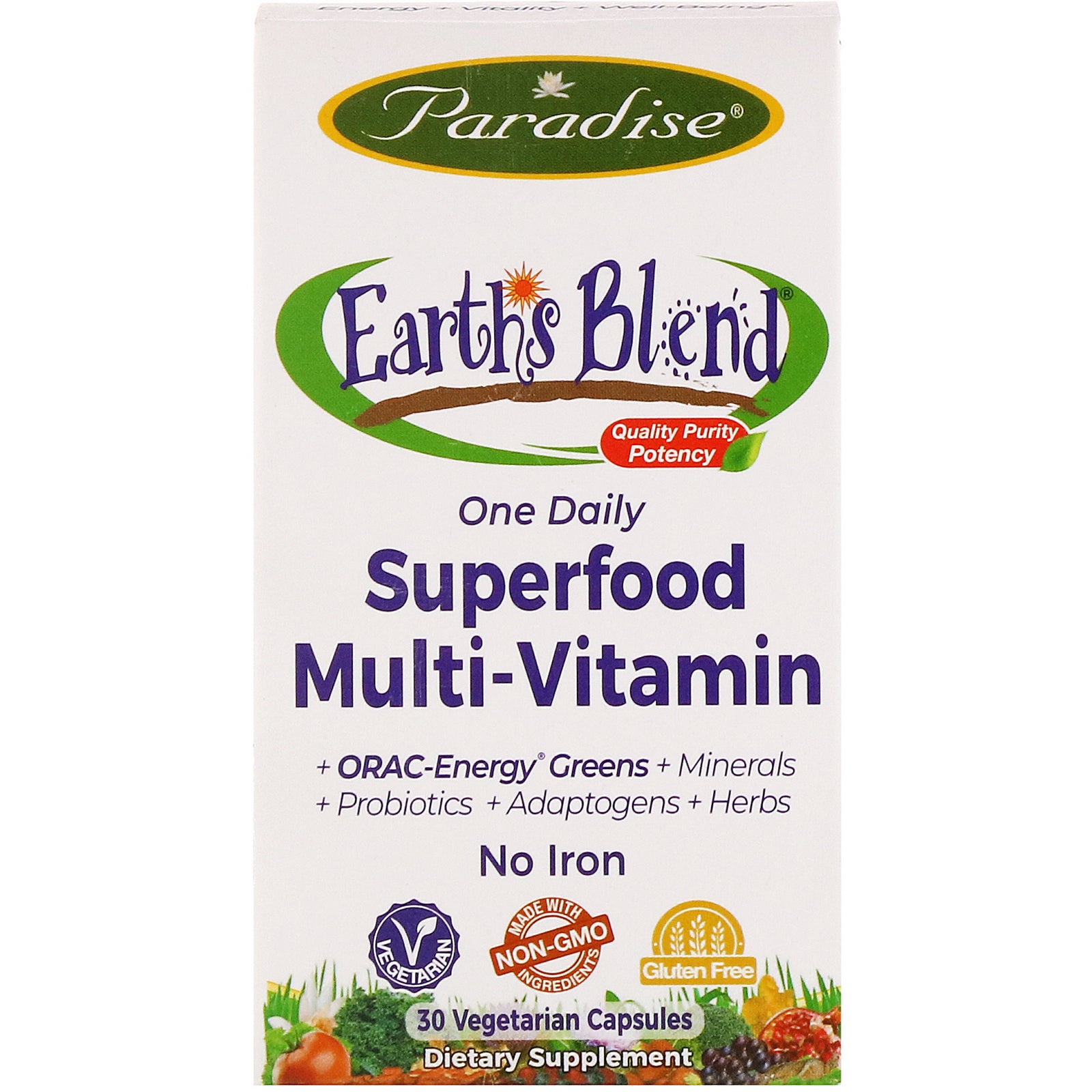 7 Servings Antioxidant Power Fruits & Vegetables Energy + Vitality + Well-Being Quality, Purity, Potency Orac-Energy Greens + Minerals + Probiotics + Adaptogens + Herbs Vegetarian Made with Non-GMO Ingredients Gluten Free Dietary Supplement Enhancing Nature's Miracles Best of Supplements Award Winner Made with Alkalizing Grass Juices Contains The Patented Original Greens Formula Quality - Pure - Potency Paradise products have won 10 Best of Supplements Awards. We are dedicated to sourcing premium ultra pure ingredients that meet the highest standards of excellence. No Unnecessary Fillers Unlike tablets that contain binders, fillers, magnesium stearate or stearic acid (which may inhibit absorption), our vegetarian capsules dissolve quickly in the digestive tract. We don't add unnecessary fillers, binders, stearates, artificial colors, flavors or preservatives to our encapsulations. Ultimate Absorption We provide the active, readily usable forms of vitamins B2, B6 & B12 while using the most soluble and absorbable mineral chelates (Krebs) as bound to citrate, aspartate-malate. Antioxidant Power of 7 Servings of Fruits & Veggies Based on our original ORAC-Energy Greens formula, just one vegetarian capsules provides the antioxidant power of over 7 servings of fruits and vegetables (4000+ ORAC). Anti-Stress and Energy Adaptogens Our premium superfood multi-vitamin contains the highest quality adaptogenic extracts such as rhodiola, ashwagandha, holy basil, astragalus, schisandra and more. These anti-stress adaptogens help to support energy, focus, vitality and overall well-being. Nature Synergized with Real Whole-Food Goodness Paradise award winning Earth's Blend is truly a Nature Synergized superfood multi-vitamin. Our formula uses real whole-food goodness paired with vitamins, minerals, probiotics, adaptogens and herbs to go beyond mere deficiencies and help support overall whole system health. Superior Superfood Antioxidant Support Free radicals are reactive species that have adverse effects on normal physiological functions. The five major types of free radicals, (hydroxyl, peroxyl, peroxynitrite, singlet oxygen, and superoxide anion), can be associated with a wide range of degenerative health conditions. Antioxidants can function as a vital line of defense against free radicals by blocking their attack on DNA, vital proteins, lipids and amino acids. Total ORAC (Oxygen Radical Absorbance Capacity) Assay Recent technology has resulted in a comprehensive new testing method called the Total ORAC Assay. With the development of the Total ORAC test, it is now possible to target and measure the effects of superfoods, vitamins and antioxidants on the full range of major free radicals found in the body. Paradise affirms its commitment to innovation and leadership in the multivitamin, superfood and antioxidant category by delivering a formula that attacks the full range of free radicals while going beyond mere deficiencies to help support overall whole system health.