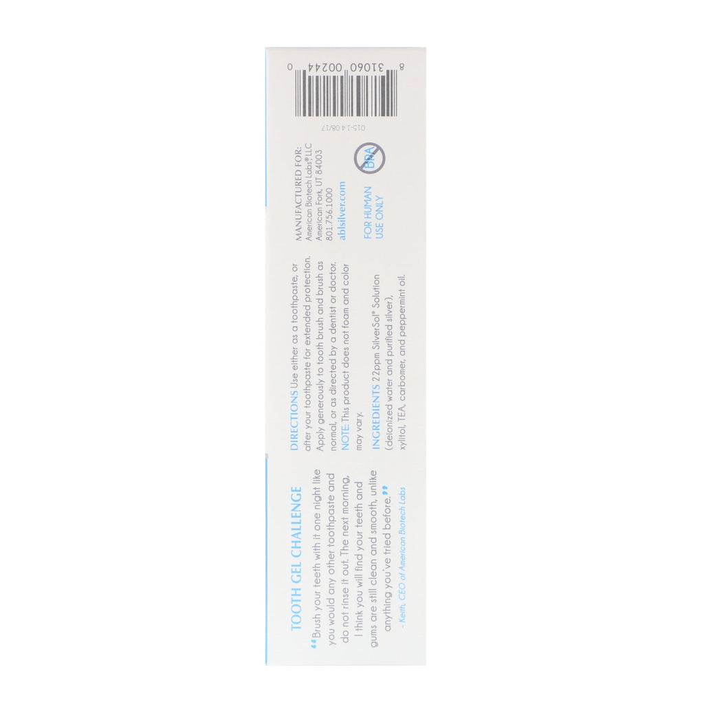 Non-Abrasive Fluoride-Free Helps Clean & Protect Up To 12 Hour Protection SilverSol Nano-Silver Infused Tooth Gel Triple Action With Xylitol & Peppermint Oil BPA Free Specifically formulated with a powerful 22 ppm silver gel to naturally promote healthy teeth & gums. Tooth Gel Challenge "Brush your teeth with it one night like you would any other toothpaste and do not rinse it out. The next morning, I think you will find your teeth and gums are still clean and smooth, unlike anything you've tried before." -Keith, CEO of American Biotech Labs The Silver Biotics Advantage American Biotech Labs - SilverSol Particle Silver particle is part of the structure of the water and as such is much more stable and bioavailable. Multiple modes of action. Patented metallic nano-silver particle with a thin multi-valent Ag4o4 silver oxide coating. Probiotic friendlySugg. UseUse either as a toothpaste, or after your toothpaste for extended protection....