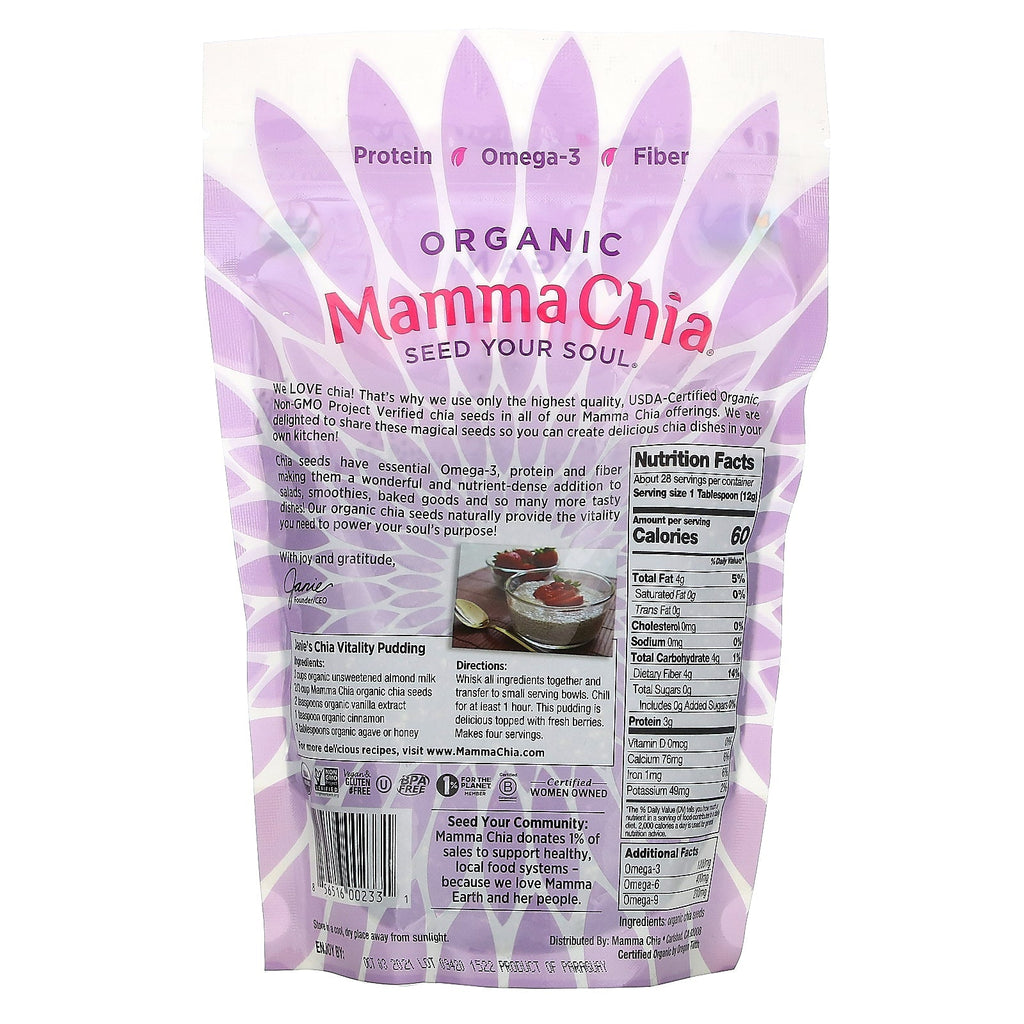Protein Omega-3 Fiber Seed Your Soul® Non GMO Project Verified USDA Black Chia Vegan & Gluten Free Kosher BPA Free Certified B Corporation Certified by Oregon Tilth We Love Chia! That's why we use only the highest quality, USDA-Certified , Non-GMO Project Verified Chia Seeds in all of our Mamma Chia offerings. We are delighted to share these magical seeds so you can create delicious chia dishes in your own kitchen! Chia seeds have essential Omega-3, protein and fiber making them a wonderful and nutrient-dense addition to salads, smoothies, baked goods and so many more tasty dishes! Our Chia Seeds will naturally provide the vitality you need to power your soul's purpose! With joy and gratitude, -Janie, Founder/CEOSugg. UseOther Ingredients chia seeds.Supplement FactsServing Size: 1 Tablespoon (12 g) Serving Per Container: About 28 Amount Per Serving %Daily Value* Calories 60 Total Fat 4 g 5% Saturated Fat 0 g 0%...
