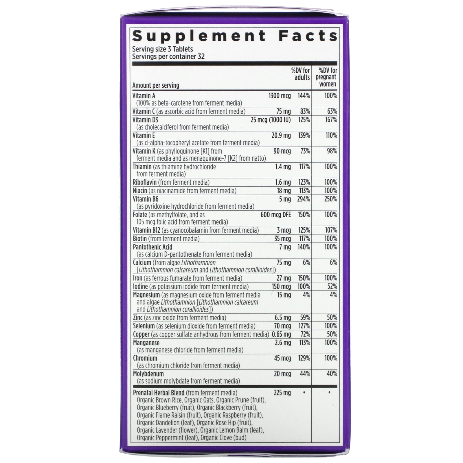 Serving Size: 3 Tablets Servings Per Container: 32 Amount Per Serving %DV for adults %DV for pregnant women Vitamin A (100% as beta-carotene from ferment media) 1300 mcg 144% 100% Vitamin C (as ascorbic acid from ferment media) 75 mg 83% 63% Vitamin D3 (as cholecalciferol from ferment media) 25 mcg (1000 IU) 125% 167% Vitamin E (as d-alpha-tocopheryl acetate from ferment media) 20.9 mg 139% 110% Vitamin K (as phylloquinone [K1] from ferment media and as menaquinone-7 [K2] from natto) 90 mcg 73% 98% Thiamin (as thiamine hydrochloride from ferment media) 1.4 mg 117% 100% Riboflavin (from ferment media) 1.6 mg 123% 100% Niacin (as niacinamide from ferment media) 18 mg 113% 100% Vitamin B6 (as pyridoxine hydrochloride from ferment media) 5 mg 294% 250% Folate (as methylfolate, and as 105 mcg folic acid from ferment media) 600 mcg DFE 150% 100% Vitamin B12 (as cyanocobalamin from ferment media) 3 mcg 125% 107% Biotin (from ferment media) 35 mcg 117% 100% Pantothenic Acid (as calcium D-pantothenate from ferment media) 7 mg 140% 100% Calcium (from algae Lithothamnion [Lithothamnion calcareum and Lithothamnion corallioides]) 75 mg 6% 6% Iron (as ferrous fumarate from ferment media) 27 mg 150% 100% Iodine (as potassium iodide from ferment media) 150 mcg 100% 52% Magnesium (as magnesium oxide from ferment media and algae Lithothamnion [Lithothamnion calcareum and Lithothamnion corallioides]) 15 mg 4% 4% Zinc (as zinc oxide from ferment media) 6.5 mg 59% 50% Selenium (as selenium dioxide from ferment media) 70 mcg 127% 100% Copper (as cooper sulfate anhydrous from ferment media) 0.65 mg 72% 50% Manganese (as manganese chloride from ferment media) 2.6 mg 113% 100% Chromium (as chromium chloride from ferment media) 45 mcg 129% 100% Molybdenum (as sodium molybdate from ferment media) 20 mcg 44% 40% Prenatal Herbal Blend (from ferment media) Organic Brown Rice, Organic Oats, Organic Prune (fruit), Organic Blueberry (fruit), Organic Blackberry (fruit), Organic Flame Raisin (fruit), Organic Raspberry (fruit), Organic Dandelion (leaf), Organic Rose Hip (fruit), Organic Lavender (flower), Organic Lemon Balm (leaf), Organic Peppermint (leaf), Organic Clove (bud) 225 mg * * Breast Support Blend Organic Broccoli (sprout), Organic Cauliflower (sprout), Organic Kale (sprout), Organic Daikon Radish (sprout), Organic Cabbage (sprout), Organic Mustard (sprout) 100 mg * * Ginger (rhizome) 50 mg aqueous extract and 12 mg organic supercritical extract 62 mg * * Organic Turmeric (rhizome) from ferment media 38.2 mg * * * Daily Value (DV) not establishedDisclaimer