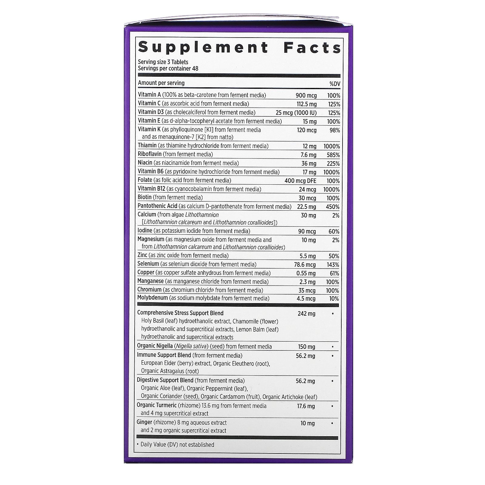 Serving Size: 3 Tablets Servings Per Container: 48 Amount Per Serving %DV Vitamin A (100% as beta-carotene from ferment media) 900 mcg 100% Vitamin C (as ascorbic acid from ferment media) 112.5 mg 125% Vitamin D3 (as cholecalciferol from ferment media) 25 mcg (1000 IU) 125% Vitamin E (as d-alpha-tocopheryl acetate from ferment media) 15 mg 100% Vitamin K (as phylloquinone [K1] from ferment media and as menaquinone-7 [K2] from natto) 120 mcg 98% Thiamin (as thiamine hydrochloride from ferment media) 12 mg 1000% Riboflavin (from ferment media) 7.6 mg 585% Niacin (as niacinamide from ferment media) 36 mg 225% Vitamin B6 (as pyridoxine hydrochloride from ferment media) 17 mg 1000% Folate (as folic acid from ferment media) 400 mcg DFE 100% Vitamin B12 (as cyanocobalamin from ferment media) 24 mcg 1000% Biotin (from ferment media) 30 mcg 100% Pantothenic Acid (as calcium D-pantothenate from ferment media) 22.5 mg 450% Calcium (from algae Lithothamnion [lithothamnion calcareum and Lithothamnion corallioides]) 30 mg 2% Iodine (as potassium iodide from ferment media) 90 mcg 60% Magnesium (as magnesium oxide from ferment media and from Lithothamnion calcareum and Lithothamnion corallioides) 10 mg 2% Zinc (as zinc oxide from ferment media) 5.5 mg 50% Selenium (as selenium dioxide from ferment media) 78.6 mcg 143% Copper (as copper sulfate anhydrous from ferment media) 0.55 mg 61% Manganese (as manganese chloride from ferment media) 2.3 mg 100% Chromium (as chromium chloride from ferment media) 35 mcg 100% Molybdenum (as sodium molybdate from ferment media) 4.5 mcg 10% Comprehensive Stress Support Blend Holy Basil (leaf) hydroethanolic extract, Chamomile (flower) hydroethanolic and supercritical extracts, Lemon Balm (leaf) hydroethanolic and supercritical extracts 242 mg * Organic Nigella (Nigella sativa) (seed) from ferment media 150 mg * Immune Support Blend (from ferment media) European Elder Berry (berry) extract, Organic Eleuthero (root), Organic Astragalus (root) 56.2 mg * Digestive Support Blend (from ferment media) Organic Aloe (leaf), Organic Peppermint (leaf), Organic Coriander (seed), Organic Cardamom (fruit), Organic Artichoke (leaf) 56.2 mg * Organic Turmeric (rhizome) 13.6 mg from ferment media and 4 mg supercritical extract 17.6 mg * Ginger (rhizome) 8 mg aqueous extract and 2 mg organic supercritical extract 10 mg * * Daily Value (DV) not establishedDisclaimer