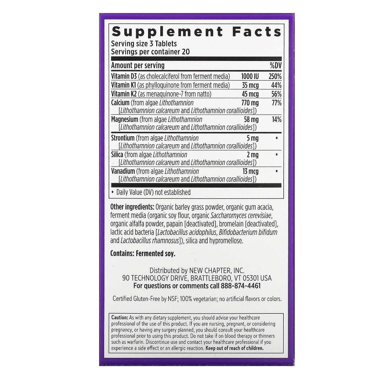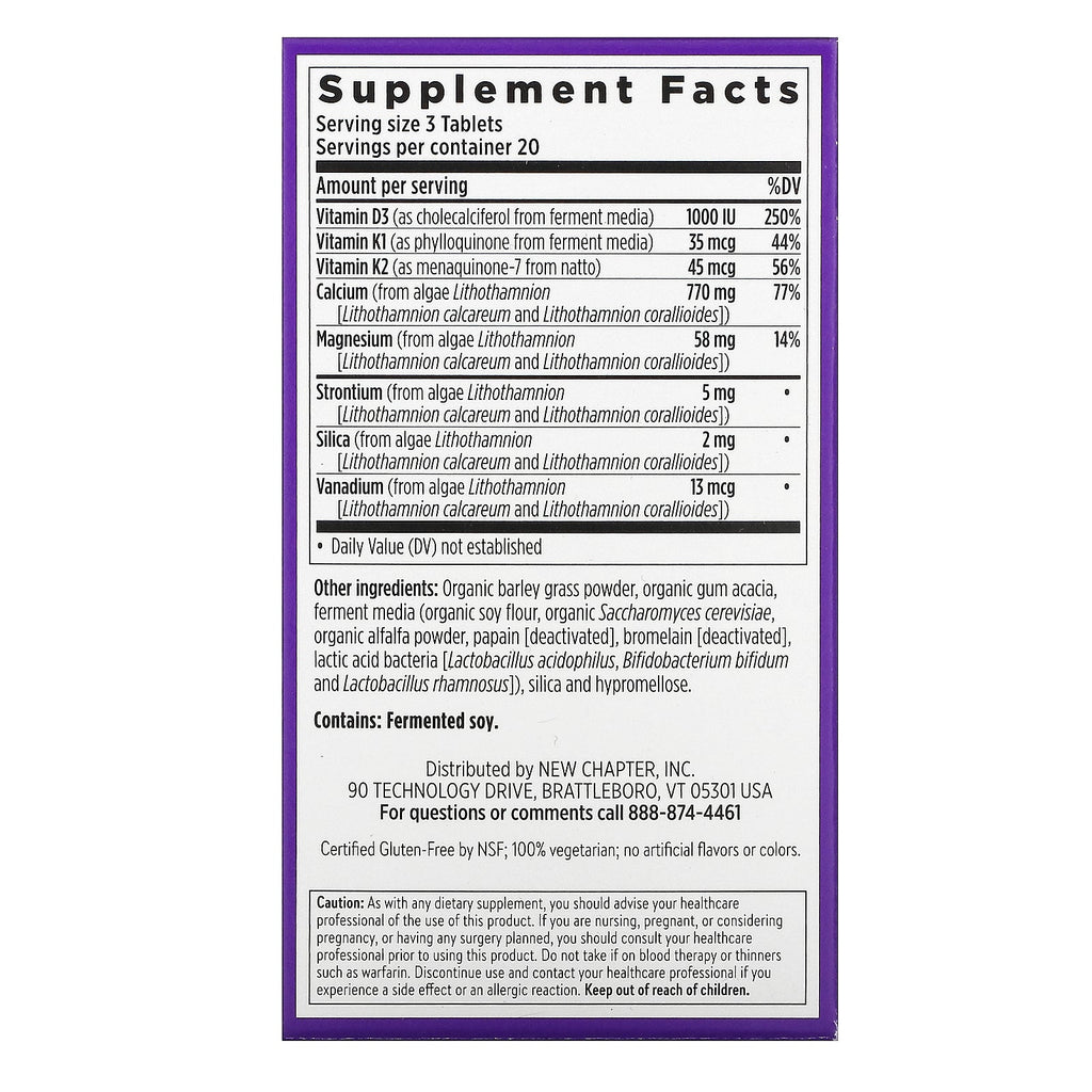 Serving Size: 3 Tablets Servings Per Container: 20 Amount Per Serving %Daily Value Vitamin D3 (as cholecalciferol from ferment media) 1000 IU 250% Vitamin K1 (as phylloquinone from ferment media) 35 mcg 44% Vitamin K2 (as menaquinone-7 from natto) 45 mcg 56% Calcium (from algae Lithothamnion [ Lithothamnion calcareum and Lithothamnion corallioides) 770 mg 77% Magnesium (from algae Lithothamnion [Lithothamnion calcareum and Lithothamnion corallioides]) 58 mg 14% Strontium (from algae Lithothamnion [Lithothamnion calcareum and Lithothamnion corallioides]) 5 mg * Silica (from algae Lithothamnion [Lithothamnion calcareum and Lithothamnion corallioides]) 2 mg * Vanadium (from algae Lithothamnion [Lithothamnion calcareum and Lithothamnion corallioides]) 13 mcg * * Daily Value (DV) not establishedDisclaimer