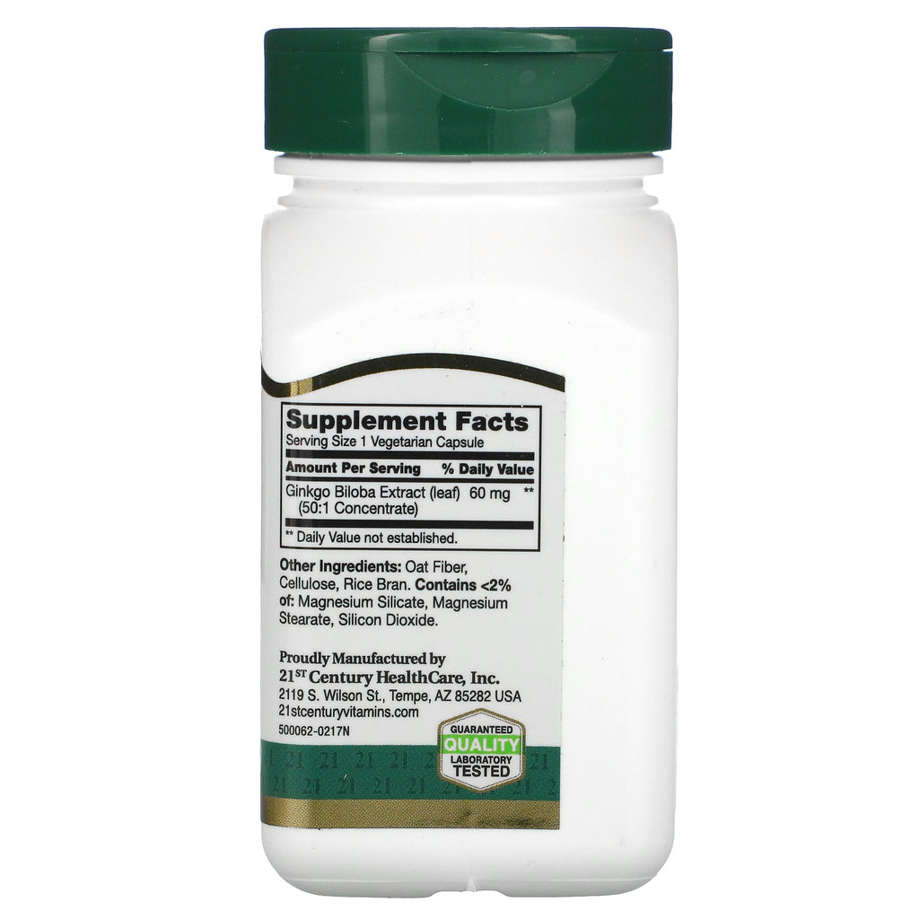 Brain, Memory & Mental Performance Support Herbal Supplement Gluten Free Guaranteed Quality - Laboratory Tested 100% Vegetarian Ginkgo Biloba Extract has been used throughout history to support the brain, memory and mental performance. 21st Century's strict adherence to high quality ensures only the finest Ginkgo Biloba Extract containing ginkgo flavone glycosides and terpene lactones is used in the manufacturing of this product.Sugg. UseAs an herbal supplement, adults take one (1) capsule with any meal, twice daily - one (1) in the morning and one (1) in the evening or as directed by a healthcare provider. Do not exceed recommended dosage. Individual results may vary.Other IngredientsOat fiber, cellulose, rice bran. Contains < 2% of: Magnesium silicate, magnesium stearate, silicon dioxide. No added sugar, salt, yeast, preservatives, artificial flavors or colors.Supplement FactsServing Size: 1 Vegetarian Capsule Amount Per Serving %Daily Value Ginkgo Biloba Extract (leaf) (50:1 Concentrate) 60 mg ** **Daily Value...