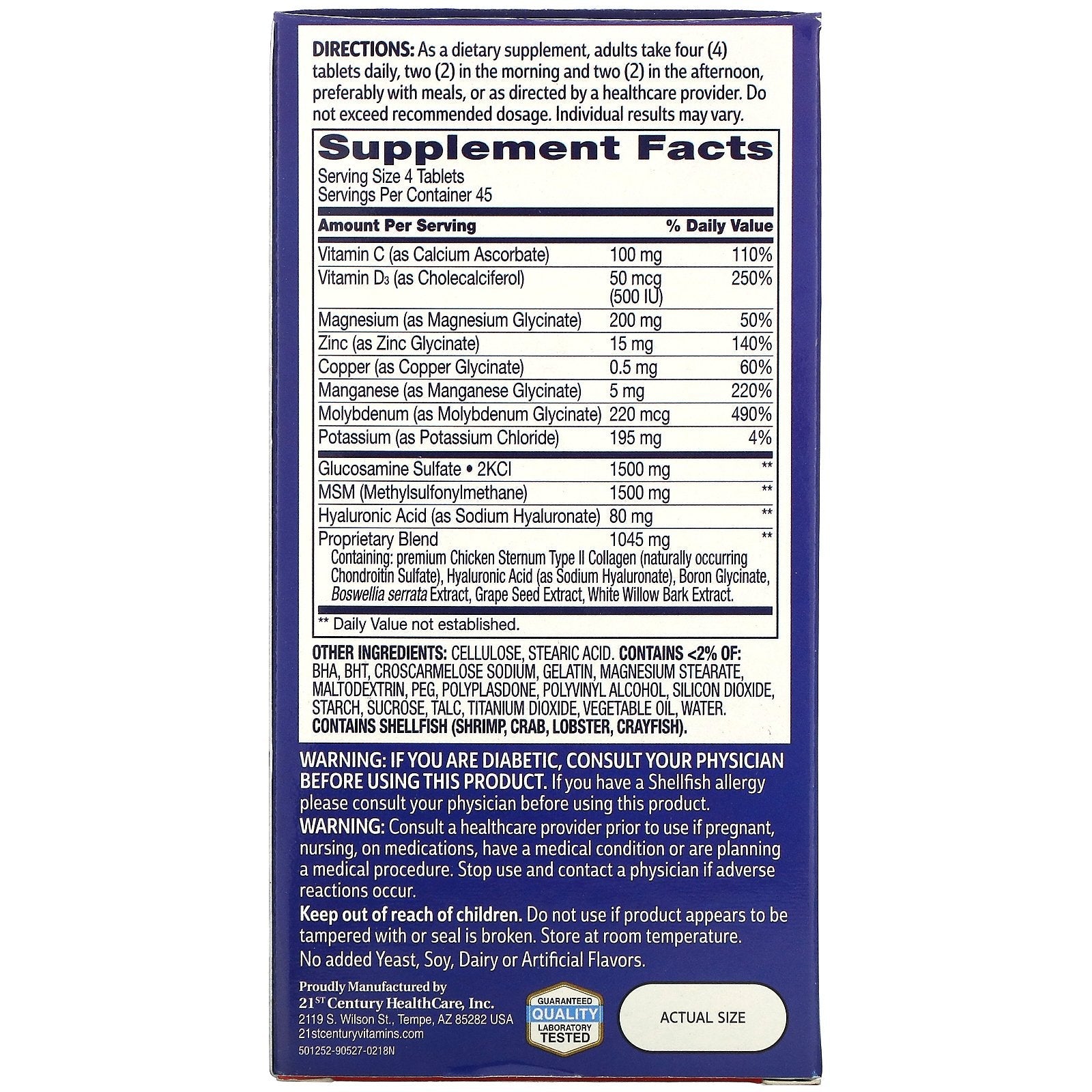 Serving Size: 4 Tablets Servings Per Container: 45 Amount Per Serving %Daily Value Vitamin C (as Calcium Ascorbate) 100 mg 110% Vitamin D3 (as Cholecalciferol) 50 mcg (500 IU) 250% Magnesium (as Magnesium Glycinate) 200 mg 50% Zinc (as Zinc Glycinate) 15 mg 140% Copper (as Copper Glycinate) 0.5 mg 60% Manganese (as Manganese Glycinate) 5 mg 220% Molybdenum (as Molybdenum Glycinate) 220 mcg 490% Potassium (as Potassium Chloride) 195 mg 4% Glucosamine Sulfate • 2 KCI 1500 mg ** MSM (Methylsulfonylmethane) 1500 mg ** Hyaluronic Acid (as Sodium Hyaluronate) 80 mg ** Proprietary Blend Containing: premium Chicken Sternum Type II Collagen (naturally occurring Chondroitin Sulfate), Hyaluronic Acid (as Sodium Hyaluronate), Boron Glycinate, Boswellia serrata Extract, Grape Seed Extract, White Willow Bark Extract. 1045 mg ** **Daily Value not established.Disclaimer