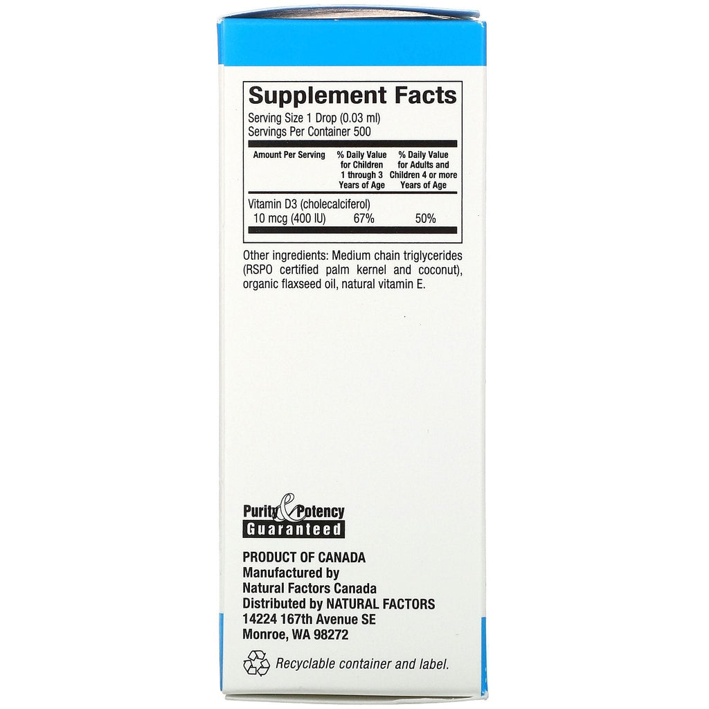 Serving Size: 1 Drop (0.03 ml) Servings Per Container: 500 Amount Per Serving % Daily Value for Children 1 through 3 Years of Age % Daily Value for Adults and Children 4 or more Years of Age Vitamin D3 (cholecalciferol) 10 mcg (400 IU) 67% 50%Disclaimer