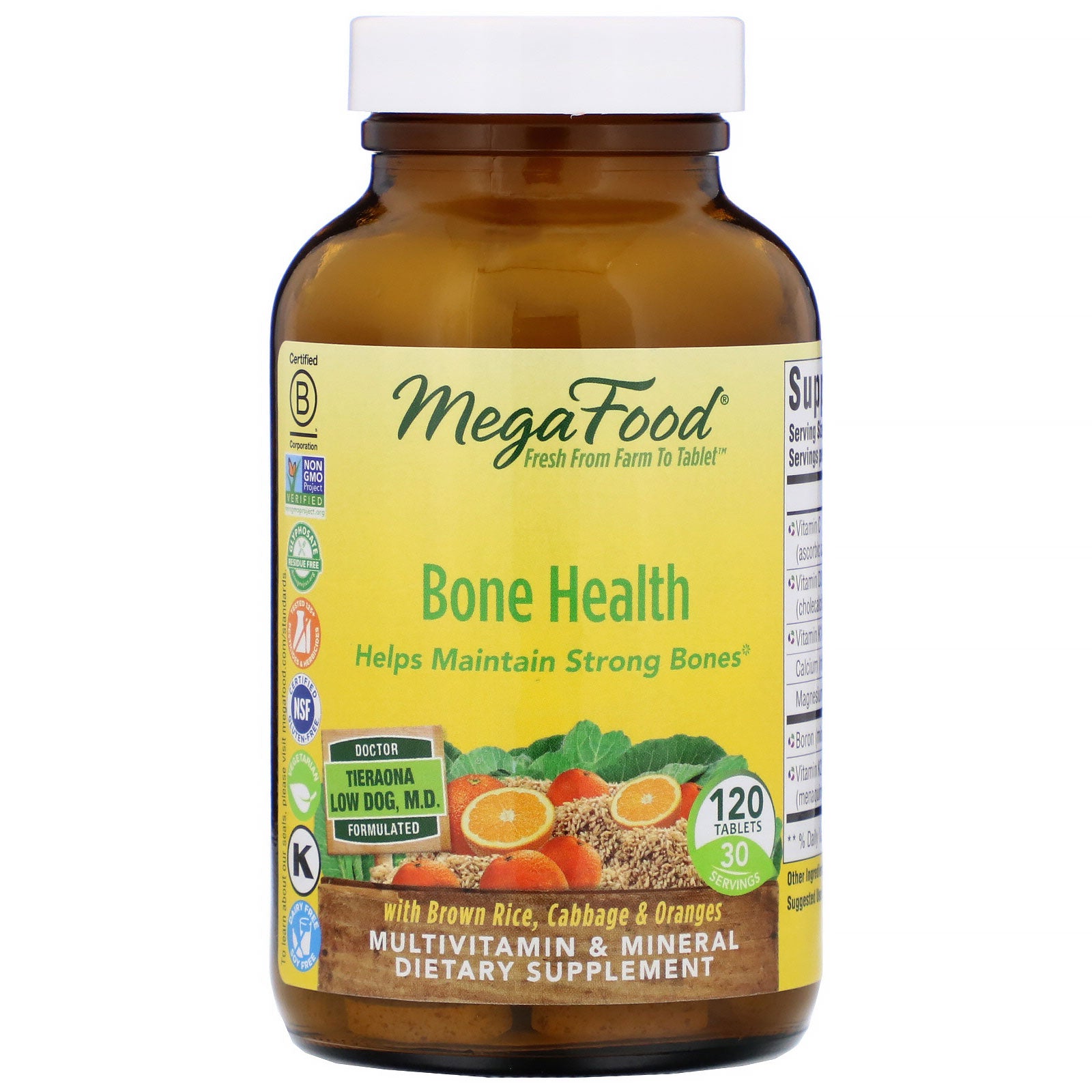 Fresh From Farm To Tablet™ Helps Maintain, Strong Bones Certified B Corporation Non GMO Project Verified Glyphosate Residue Free - No Toxic Herbicide Tested Free of 125+ Pesticides & Herbicides NSF Certified Gluten-Free Vegetarian Kosher Dairy Free Soy Free Doctor Tieraona Low Dog, M.D. Formulated 30 Servings With Brown Rice, Cabbage & Oranges Multivitamin & Mineral Dietary Supplement MegaFood Bone Health is formulated by award-winning integrative medical physician. Tieraona Low Dog, M.D., and contains vitamins C, D, K1 and K2, plus calcium and magnesium, to support healthy bones. Meet Our Farmers: We believe that the most nutritious food comes from healthy soils and valued farmers. Our goal is to work with farmers who share our commitment to organic and regenerative agriculture.Sugg. Use2 tablets twice a day with food.Other IngredientsStearic acid, silica, guar gum, cellulose.Supplement FactsDisclaimerWhile VitaminsUK strives to ensure the accuracy of its product images and information, some manufacturing changes...