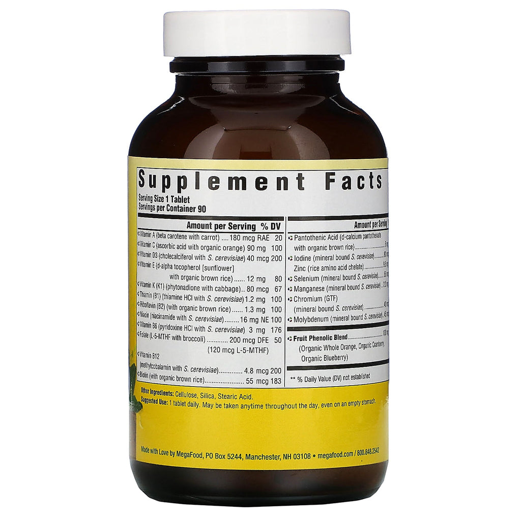 Serving Size: 1 Tablet Servings Per Container: 90 Amount Per Serving % DV ♦Vitamin A (beta-carotene with carrot) 180 mcg RAE 20 ♦Vitamin C (ascorbic acid with organic orange) 90 mg 100 ♦Vitamin D3 (cholecalciferol with S. cerevisiae) 40 mcg 200 ♦Vitamin E (d-alpha tocopherol [sunflower] with organic brown rice) 12 mg 80 ♦Vitamin K (K1) (phytonadione with cabbage) 80 mcg 67 ♦Thiamin (B1) (thiamine HCl with S. cerevisiae) 1.2 mg 100 ♦Riboflavin (B2) (with organic brown rice) 1.3 mg 100 ♦Niacin (niacinamide with S. cerevisiae) 16 mg NE 100 ♦Vitamin B6 (pyridoxine HCl with S. cerevisiae) 3 mg 176 ♦Folate (L-5-MTHF with broccoli) 200 mcg DFE (120 mcg L5-MTHF) 50 ♦Vitamin B12 (methylcobalamin with S. cerevisiae) 4.8 mcg 200 ♦Biotin (with organic brown rice) 55 mcg 183 ♦Pantothenic Acid (d-calcium pantothenate with organic brown rice) 5 mg 100 ♦Iodine (mineral bound S. cerevisiae) 80 mcg 53 ♦Zinc (rice amino acid chelate) 9.5 mg 86 ♦Selenium (mineral bound S. cerevisiae) 55 mcg 100 ♦Manganese (mineral bound S. cerevisiae) 2.3 mg 100 ♦Chromium (GTF) (mineral bound S. cerevisiae) 40 mcg 114 ♦Molybdenum (mineral bound S. cerevisiae) 45 mcg 100 ♦Fruit Phenolic Blend (Organic Whole Orange, Organic Cranberry, Organic Blueberry) 100 mg ** ** % Daily Value (DV) not established. ♦This MegaFood product is made with real food sourced from our trusted family farm partners, wholesome nutritional yeast and added nutrients. Each vitamin or mineral is paired with an ideal whole food using our unique process to deliver guaranteed potency and the benefit of health-promoting compounds present in the whole food itself.Disclaimer