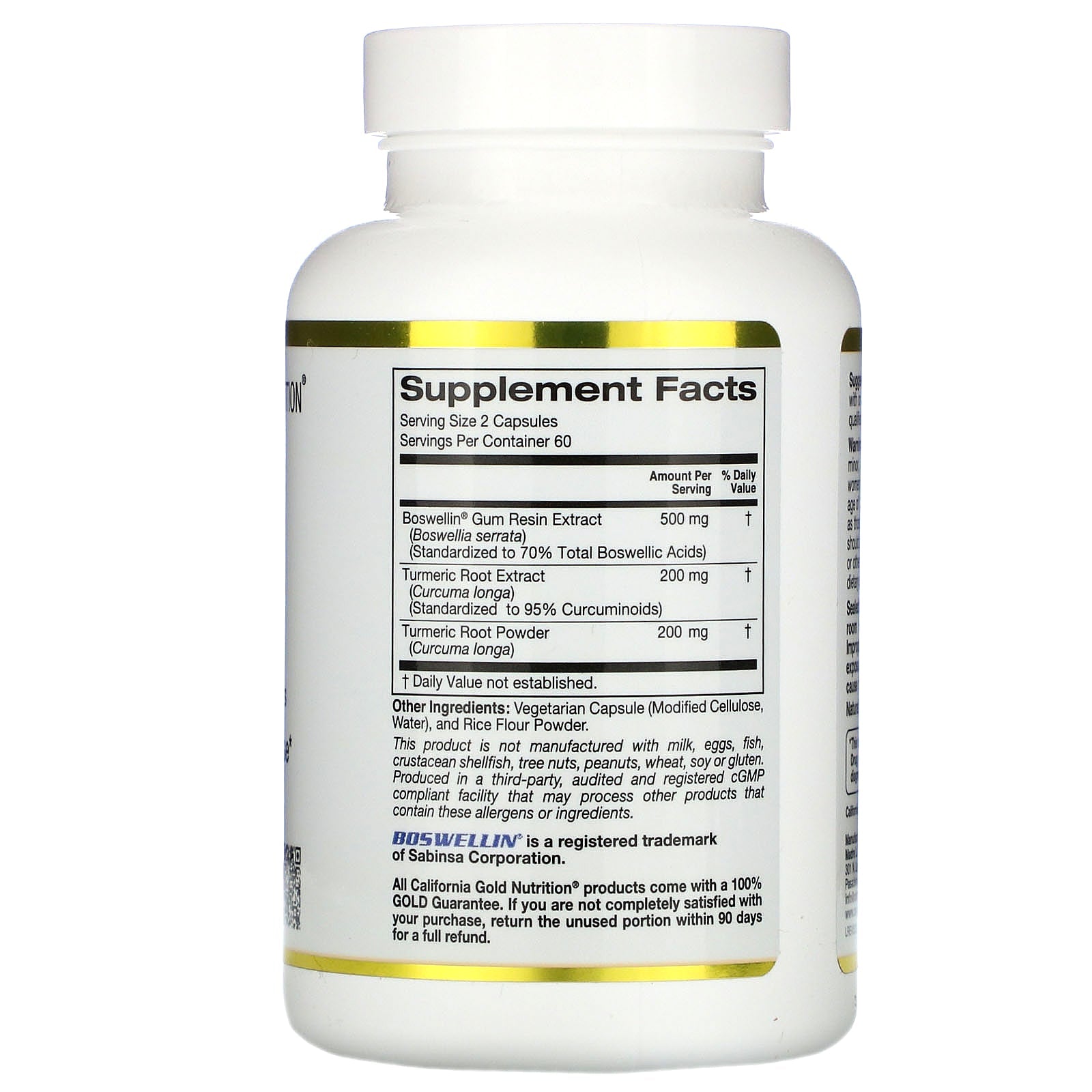Main Ingredients Boswellia Extract (Boswellia serrata) (gum resin)(Standardized to 70% Total Boswellic Acids), Turmeric Extract (Curcuma longa) (rhizome)(Standardized to 95% Curcuminoids), Turmeric Powder (Curcuma longa)(root) Other Ingredients Vegetable Capsule (Modified Cellulose, Water), and Rice Flour. Formulated with Boswellin® Boswellia Extract. Boswellin® is a registered trademark of Sabinsa Corporation. This product is not manufactured with milk, eggs, fish, crustacean shellfish, tree nuts, peanuts, wheat, soy or gluten. Produced in a third-party, audited and registered cGMP compliant facility that may process other products that contain these allergens or ingredients.Supplement Facts