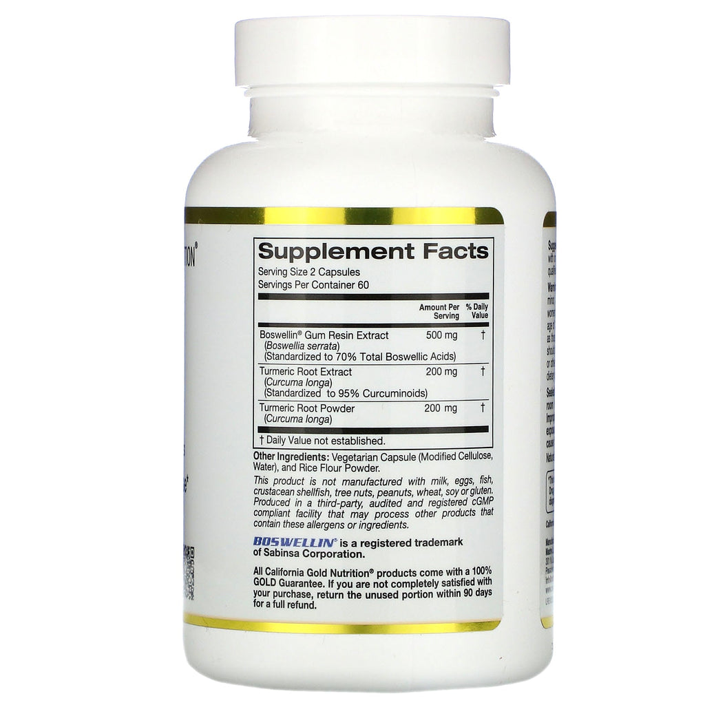 California Gold Nutrition Boswellia Extract Plus Turmeric Extract Boswellic Acid & Curcuminoids Balanced Immune Response* Suitable for Vegans & Vegetarians Standardized Boswellia to 70% Boswellic Acid Standardized Turmeric to 95% Curcuminoids Formulated to Contain: No Gluten, No GMOs, No Soy Produced in a 3rd Party Audited cGMP Registered (Certified) Facility 100% Gold Guarantee Boswellia serrata, also known as Frankincense, is a resinous botanical that has been used traditionally around the world for centuries. Bioactive constituents of Boswellia, such as Boswellic Acids, have shown in scientific studies to help support a balanced immune response and may be helpful for joint and general aches and pains throughout the body.* Turmeric root (Curcuma longa) is another botanical with a rich history. Research suggests that it is the Curcuminoids within the Turmeric root and rhizome that account for its supportive anti-inflammatory effects.* California Gold Nutrition Boswellia Extract plus Turmeric Extract combines Boswellia standardized to 70% Boswellic Acid and Turmeric standardized 95% Curcuminoids. iHerb Blog: Potential Turmeric and Boswellia Benefits 14 Ways to Reverse Inflammation iTested Verified
