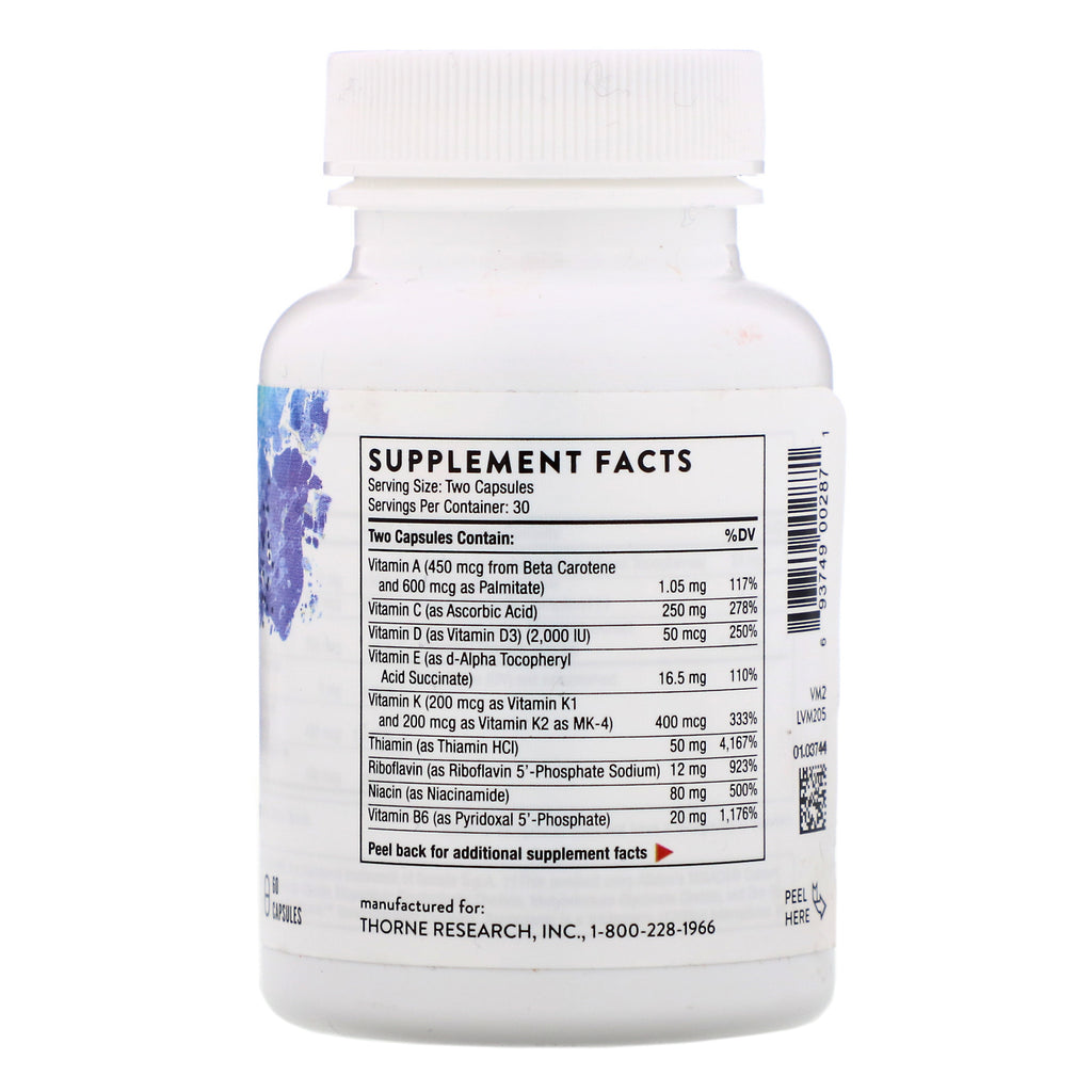 Serving Size: Two Capsules Serving Per Container: 30 Two Capsules Contain: %DV Vitamin A (450 mcg from Beta Carotene and 600 mcg as Palmitate) 1.05 mg 117% Vitamin C (as Ascorbic Acid) 250 mg 278% Vitamin D (as Vitamin D3) (2,000 IU) 50 mcg 250% Vitamin E (as d-Alpha Tocopheryl Acid Succinate) 16.5 mg 110% Vitamin K (200 mcg as Vitamin K1 and 200 mcg as Vitamin K2 as MK-4) 400 mcg 333% Thiamin (as Thiamin HCI) 50 mg 4,167% Riboflavin (as Riboflavin 5'-Phosphate Sodium) 12 mg 923% Niacin (as Niacinamide) 80 mg 500% Vitamin B6 (as Pyridoxal 5'-Phosphate) 20 mg 1,176% Folate (400 mcg as L-5-Methyltetrahydrofolate† from L-5 Methyltetrahydrofolic Acid, Glucosamine Salt) 680 mcg DEF 170% Vitamin B12 (as Methylcobalamin) 600 mcg 25,000% Biotin 500 mcg 1,667% Pantothenic Acid (as Calcium Pantothenate) 45 mg 900% Calcium (as TRAACS® Calcium Bisglycinate Chelate) †† 30 mg 2% Iodine (as Potassium Iodide) 75 mcg 50% Magnesium (as TRAACS® Magnesium Bisglycinate Chelate) †† 20 mg 5% Zinc (as TRAACS® Zinc Bisglycinate Chelate) †† 15 mg 136% Selenium (as L-Selenomethionine) 200 mcg 364% Copper (as TRAACS® Copper Bisglycinate Chelate) †† 750 mcg 83% Manganese (as TRAACS® Manganese Bisglycinate Chelate) †† 3 mg 130% Chromium (as TRAACS® Chromium Nicotinate Glycinate Chelate) †† 400 mcg 1,143% Molybdenum (as TRAACS® Molybdenum Glycinate Chelate) †† 100 mcg 222% d-Gamma Tocopherol (from Mixed Tocopherols) 24 mg * Boron (as Bororganic™ Boron Glycinate Complex) ††† 2 mg * Lutein (from Aztec Marigold extract (flower) (Tagetes erecta) 140 mcg * *Daily Value (DV) not established. †This product uses Gnosis S.p.A.'s L-5 Methyltetrahydrofolic Acid, Glucosamine Salt (Quatrefolic®). ††This product uses Albion's TRAACS® Calcium Bisglycinate Chelate, Chromium Nicotinate Glycinate Chelate, Copper Bisglycinate Chelate, Manganese Bisglycinate Chelate, Magnesium Bisglycinate Chelate, Molybdenum Glycinate Chelate, and Zinc Bisglycinate Chelate. ††† This product uses Albion's Bororganic™ Boron Glycinate Complex. Gamma tocopherol does not have a recognized IU equivalent.Disclaimer