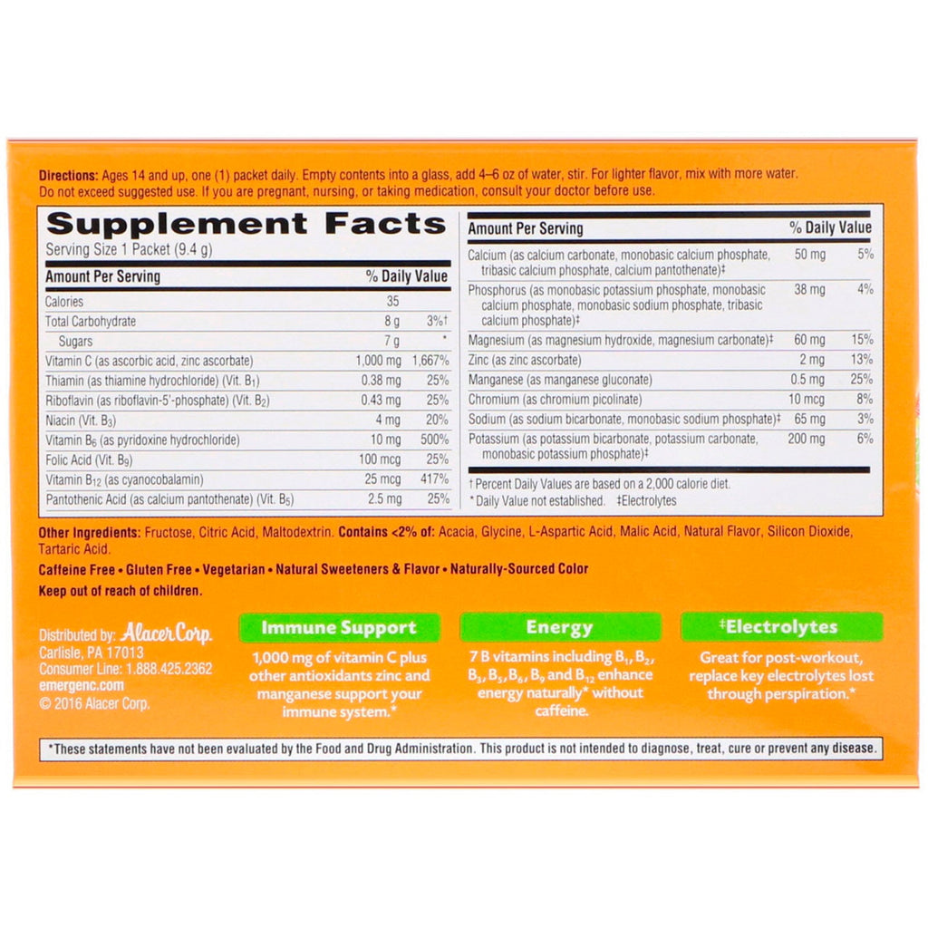 Serving Size: 1 Packet (9.4 g) Amount Per Serving % Daily Value Calories 35 Total Carbohydrate 8 g 3%† Sugars 7 g * Vitamin C (as ascorbic acid, zinc ascorbate) 1,000 mg 1,667% Thiamin (as thiamine hydrochloride) (Vit. B1) 0.38 mg 25% Riboflavin (as riboflavin-5'-phosphate) (Vit. B2) 0.43 mg 25% Niacin (Vit. B3) 4 mg 20% Vitamin B6 (as pyridoxine hydrochloride) 10 mg 500% Folic Acid (Vit.B9) 100 mcg 25% Vitamin B12 (as cyanocobalamin) 25 mcg 417% Pantothenic Acid (as calcium pantothenate) (Vit. B5) 2.5 mg 25% Calcium (as calcium carbonate, monobasic calcium phosphate, tribasic calcium phosphate, calcium pantothenate)‡ 50 mg 5% Phosphorus (as monobasic potassium phosphate, monobasic calcium phosphate, monobasic sodium phosphate, tribasic calcium phosphate)‡ 38 mg 4% Magnesium (as magnesium hydroxide, magnesium carbonate)‡ 60 mg 15% Zinc (as zinc ascorbate) 2 mg 13% Manganese (as manganese gluconate) 0.5 mg 25% Chromium (as chromium picolinate) 10 mcg 8% Sodium (as sodium bicarbonate, monobasic sodium phosphate)‡ 65 mg 3% Potassium (as potassium bicarbonate, potassium carbonate, monobasic potassium phosphate)‡ 200 mg 6% † Percent Daily Values are based on a 2,000 calorie diet. * Daily Value not established. ‡Electrolytes.Disclaimer