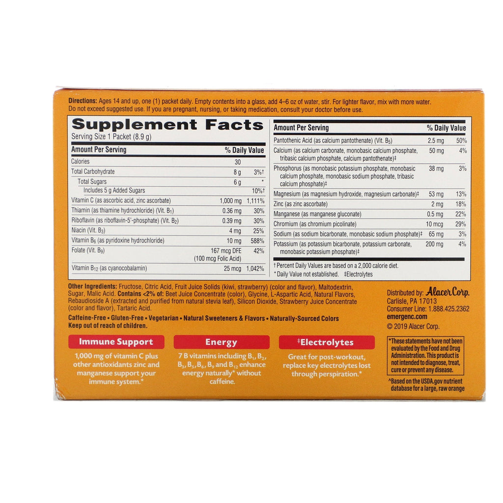 Antioxidants†, B Vitamins & Electrolytes Natural Fruit Flavors As Much Vitamin C as 10 Oranges!^ Flavored Fizzy Drink with Other Natural Flavors Caffeine-Free, Gluten-Free, Vegetarian & Natural Sweeteners Dietary Supplement Feel the Good® Naturally-Sourced Colors Naturally, It's Good for you! Delicious Strawberry-Kiwi flavor? Check! Fun and fizz? Check! With each sip, you can feel the essential nutrients flow through your body in a wave of Emergen-C® rejuvenation. If feeling good is your thing, you found the right box. Immune Support : 1,000 mg of Vitamin C plus other antioxidants zinc and manganese support your immune system. Energy: 7 B vitamins including B1, B2, B3, B5, B6, B9 and B12 enhance energy naturally without caffeine. ‡Electrolytes: Great for post-workout, replace key electrolytes lost through perspiration. †Vitamin C, Zinc & Manganese ^Based on the USDA. gov nutrient database for a large, raw orange