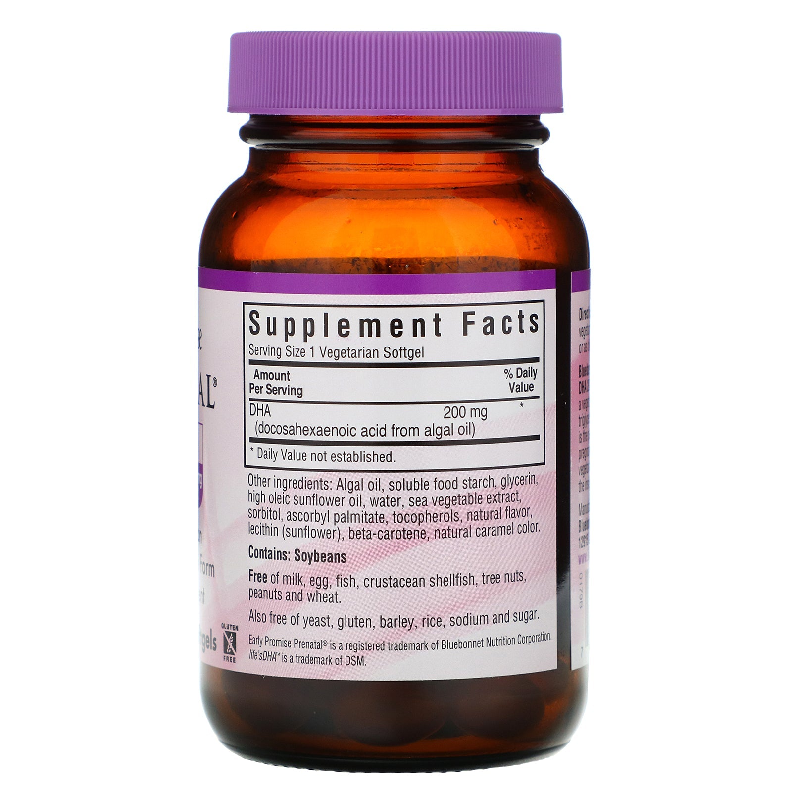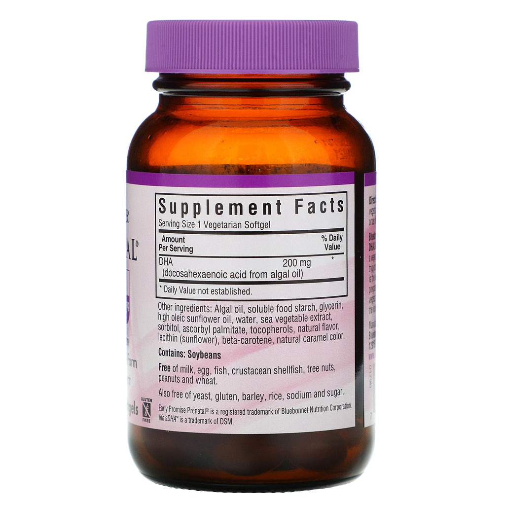 100% Vegetarian High DHA Natural Triglyceride Form Pharmaceutical Grade Algal Oil Dietary Supplement Vegetarian Gluten Free 3rd Party Tested - Purity • Potency • Freshness Guaranteed Life's DHA by Martek Bluebonnet's Early Promise Prenatal Gentle DHA 200 mg Vegetarian Softgels provide life'sDHA, a pharmaceutical-grade, vegetable-based docosahexaenoic acid (DHA) in a natural triglyceride form derived from marine algae. Life'sDHA is the perfect complement to any woman’s diet during pregnancy and/or lactation. Available in easy-to-swallow vegetarian softgels for a truly vegetarian formula from the inside out.Sugg. UseAs a dietary supplement, take one vegetarian softgel daily, preferably with a meal or as directed by a healthcare practitioner.Other IngredientsAlgal oil, soluble food starch, glycerin, high oleic sunflower oil, water, sea vegetable extract, sorbitol, ascorbyl palmitate, tocopherols, natural flavor, lecithin (sunflower), beta-carotene, natural caramel color. Contains: Soybeans Free of milk, egg, fish, crustacean shellfish, tree nuts, peanuts and wheat. Also free of yeast, gluten, barley,...
