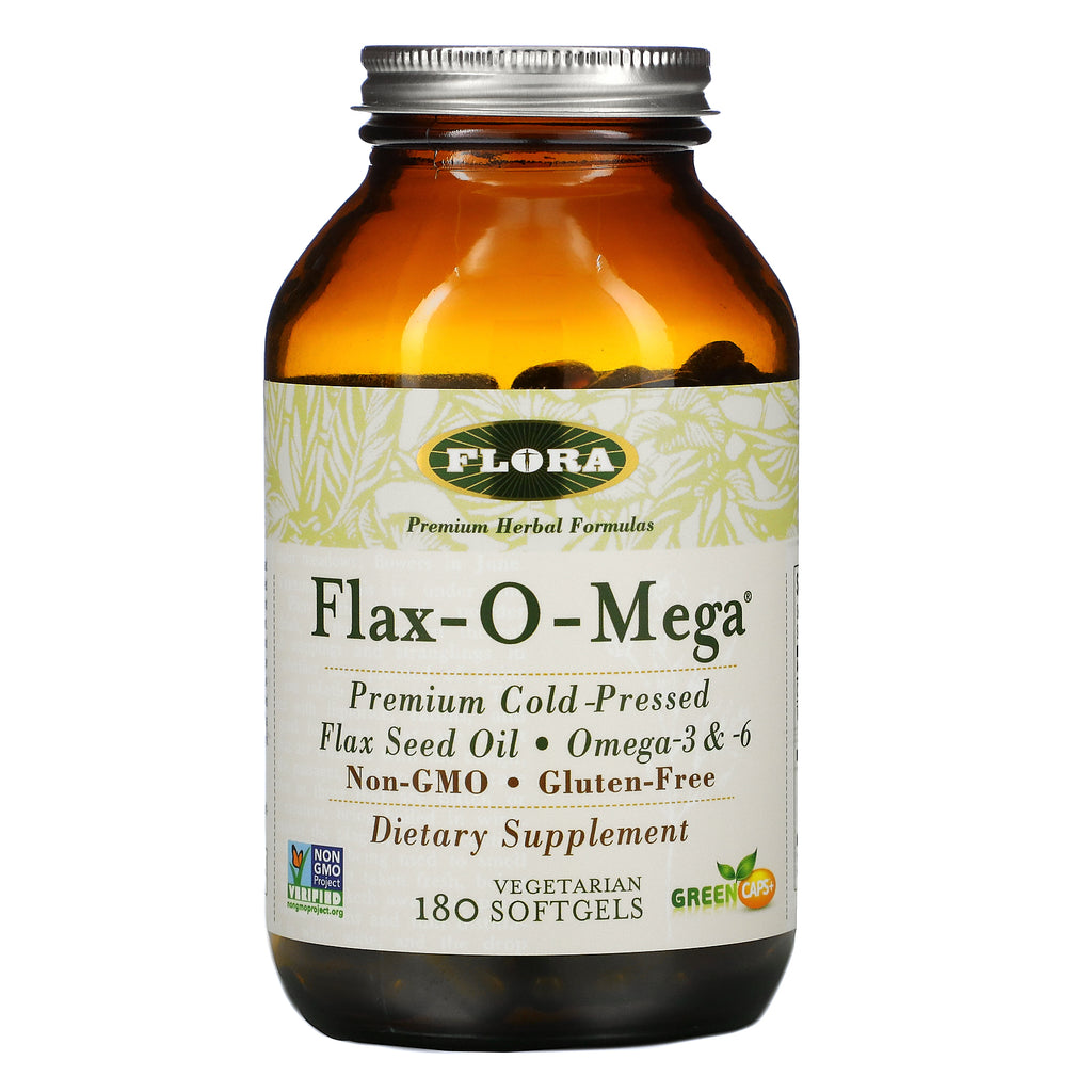 Premium Herbal Formulas Premium Cold-Pressed Flax Seed Oil Omega-3 &-6 Gluten-Free Dietary Supplement Non GMO Project Verified GreenCaps+ The oil in Flax-O-Mega ® softgels is cold-pressed and unrefined from the highest quality, certified organic flax seeds available. It is carefully extracted in a low-heat, light- and oxygen-free environment. Flax-O-Mega ® provides omega-3 (1,100 mg) and omega-6 (300 mg) essential fatty acids (EFAs) per serving. These two EFAs are important for the maintenance of good health. Omega-3 EFA is involved with neurological development and growth. *Flora tests every batch of flax seeds to make sure they're free of gluten. What are GreenCaps? GreenCaps are new and innovation vegetarian softgels that replace animal-based gelatin caps.Sugg. UseTake 2 capsules three times a day with meals.Other IngredientsFlax seed oil in softgel of modified food starch, carrageenan (seaweed extract), glycerin, sorbitol, water and caramel (color). Manufactured in a facility that also processes mustard and wheat.Supplement...