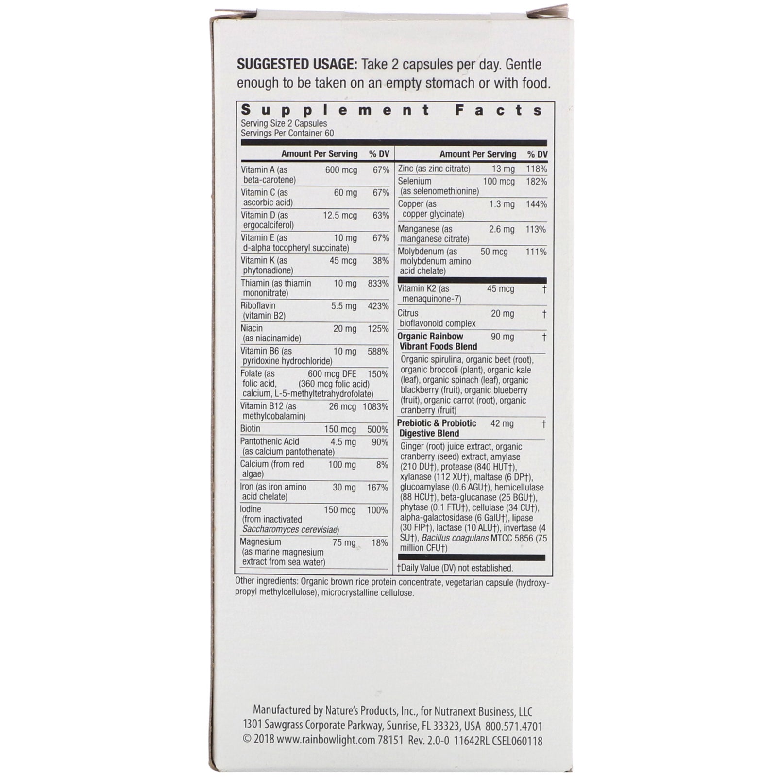 Serving Size: 2 Capsules Servings Per Container: 60 Amount Per Serving %Daily Value Vitamin A (as beta-carotene) 600 mcg 67% Vitamin C (as ascorbic Acid) 60 mg 67% Vitamin D (as ergocalciferol) 12.5 mcg 63% Vitamin E (as d-alpha tocopheryl succinate) 10 mg 67% Vitamin K (as phytonadione) 45 mcg 38% Thiamin (as thiamin mononitrate) 10 mg 833% Riboflavin (vitamin B-2) 5.5 mg 423% Niacin (as niacinamide) 20 mg 125% Vitamin B-6 (as pyridoxine hydrochloride) 10 mg 588% Folate (as calcium L-5-methyltetrahydrolate) 600 mcg DFE (360 mcg folic acid) 150% Vitamin B-12 (as methylcobalamin) 26 mcg 1083% Biotin 150 mcg 500% Pantothenic Acid (as calcium pantothenate) 4.5 mg 90% Calcium (from red algae) 100 mg 8% Iron (as iron amino acid chelate) 30 mg 167% Iodine (from inactivated Saccharomyces cerevisiae) 150 mcg 100% Magnesium (as marine magnesium extract from sea water) 75 mg 18% Zinc (as zinc citrate) 13 mg 118% Selenium (as selenomethionine) 100 mcg 182% Copper (as coppe glycinate) 1.3 mg 144% Manganese (as manganese citrate) 2.6 mg 113% Molybdenum (as molybdenum amino acid chelate) 50 mcg 111% Vitamin K2 (as menaquinone-7) 45 mcg † Citrus bioflavonoid complex 20 mg † Organic Rainbow Vibrant Foods Blend Organic spirulina, organic beet (root) powder, organic broccoli (plant) powder, organic kale (leaf) powder, organic spinach (leaf) powder, organic blackberry (fruit), organic blueberry (fruit), organic carrot (root), organic cranberry (fruit) 90 mg † Prebiotic & Probiotic Digestive Blend Ginger (root) juice extract, organic cranberry (seed) extract, amylase (210 DU†), protease (840 HUT†), xylanase (112 XU†), maltase (6 DP†), glucoamylase (0.6 AGU†), hemicellulase (88 HCU†), beta-glucanase (25 BGU†), phytase (0.1 FTU†), cellulase (34 CU†), alpha-galactosidase (6 GalU†), lipase (30 FIP†), lactase (10 ALU†), invertase (4 SU†), bacillus coagulans MTCC 5856 (75 million CFU†) 42 mg † †Daily Value (DV) not established.Disclaimer