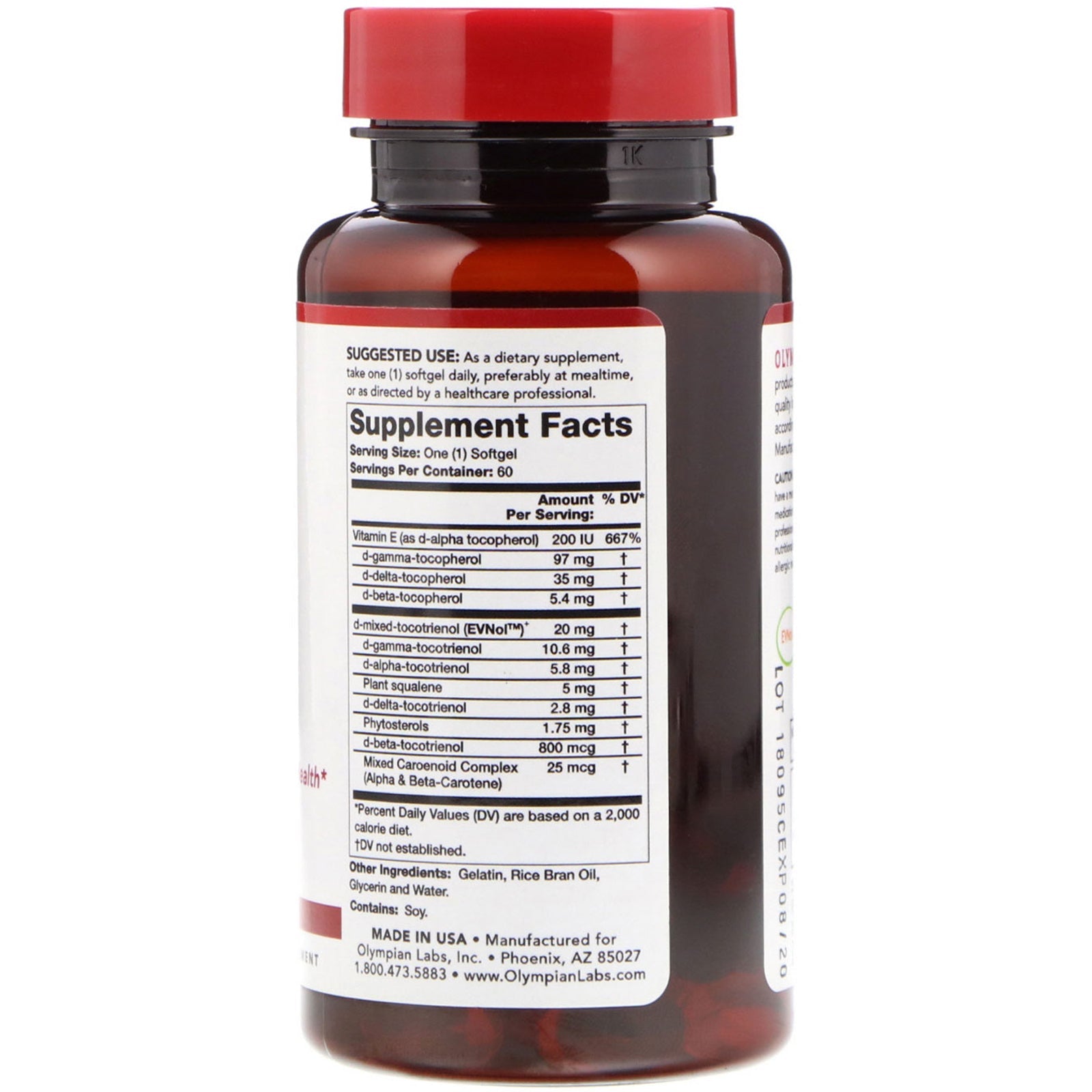 Serving Size: One (1) Softgel Servings Per Container: 60 Amount Per Serving: % Daily Value* Vitamin E (as d-alpha tocopherol) 200 IU 667% d-gamma-tocopherol 97 mg † d-delta-tocopherol 35 mg † d-beta-tocopherol 5.4 mg † d-mixed-tocotrienol (ENNol) 20 mg † d-gamma-tocotrienol 10.6 mg † d-alpha-tocotrienol 5.8 mg † Plant squalene 5 mg † d-delta-tocotrienol 2.8 mg † Phytosterols 1.75 mg † d-beta-tocotrienol 800 mcg † Mixed Carotenoid Complex (Alpha & Beta-Carotene) 25 mcg † *Percent Daily Values (DV) are based on a 2,000 calorie diet. †DV not established.Disclaimer