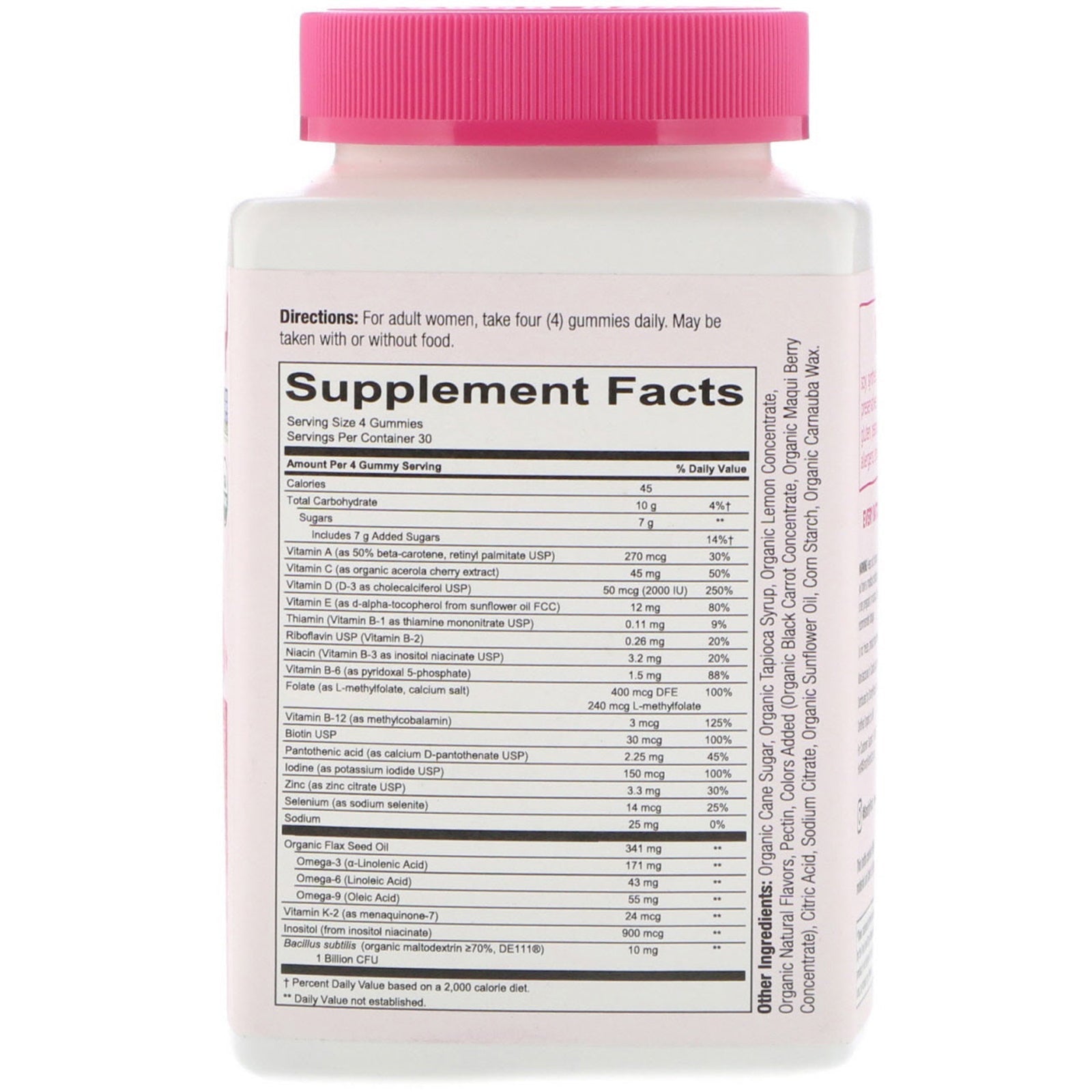 Serving Size : 4 Gummies Serving Per Container : 30 Amount Per 4 Gummy Serving % Daily Value Calories 45 Total Carbohydrate 10 g 4%† Sugars 7 g ** Includes 7 g Added Sugars 14%† Vitamin A (as 50% beta-carotene, retinyl palmitate USP) 270 mcg 30% Vitamin C (as acerola cherry extract) 45 mg 50% Vitamin D (D-3 as cholecalciferol USP) 50 mcg (2000 IU) 250% Vitamin E (as d-alpha-tocopherol from sunflower oil FCC) 12 mg 80% Thiamin (Vitamin B-1 as thiamine mononitrate USP) 0.11 mg 9% Riboflavin USP (Vitamin B-2) 0.26 mg 20% Niacin (Vitamin B-3 as inositol niacinate USP) 3.2 mg 20% Vitamin B-6 (as pyridoxal 5-phosphate) 1.5 mg 88% Folate (as L-methylfolate, calcium salt) 400 mcg DFE 240 mcg L-methylfolate 100% Vitamin B-12 (as methylcobalamin) 3 mcg 125% Biotin USP 30 mcg 100% Pantothenic acid (as calcium D-pantothenate USP) 30 mg 100% Iodine (as potassium iodide USP) 150 mcg 100% Zinc (as zinc citrate USP) 3.3 mg 30% Selenium (as sodium selenite) 14 mcg 25% Sodium 25 mg 0% Flax Seed Oil 341 mg ** Omega-3 (α-Linoleic Acid) 171 mg ** Omega-6 (Linoleic Acid) 43 mg ** Omega-9 (Oleic Acid) 55 mg ** Vitamin K-2 (menaquinone-7) 24 mcg ** Inositol (from inositol niacinamide) 900 mg ** Bacillus subtilis ( maltodextrin ≥ 70%, DE111) 1 Billion CFU 10 mg ** † Percent Daily Values are based on a 2,000 calorie diet. ** Daily Value not established.Disclaimer