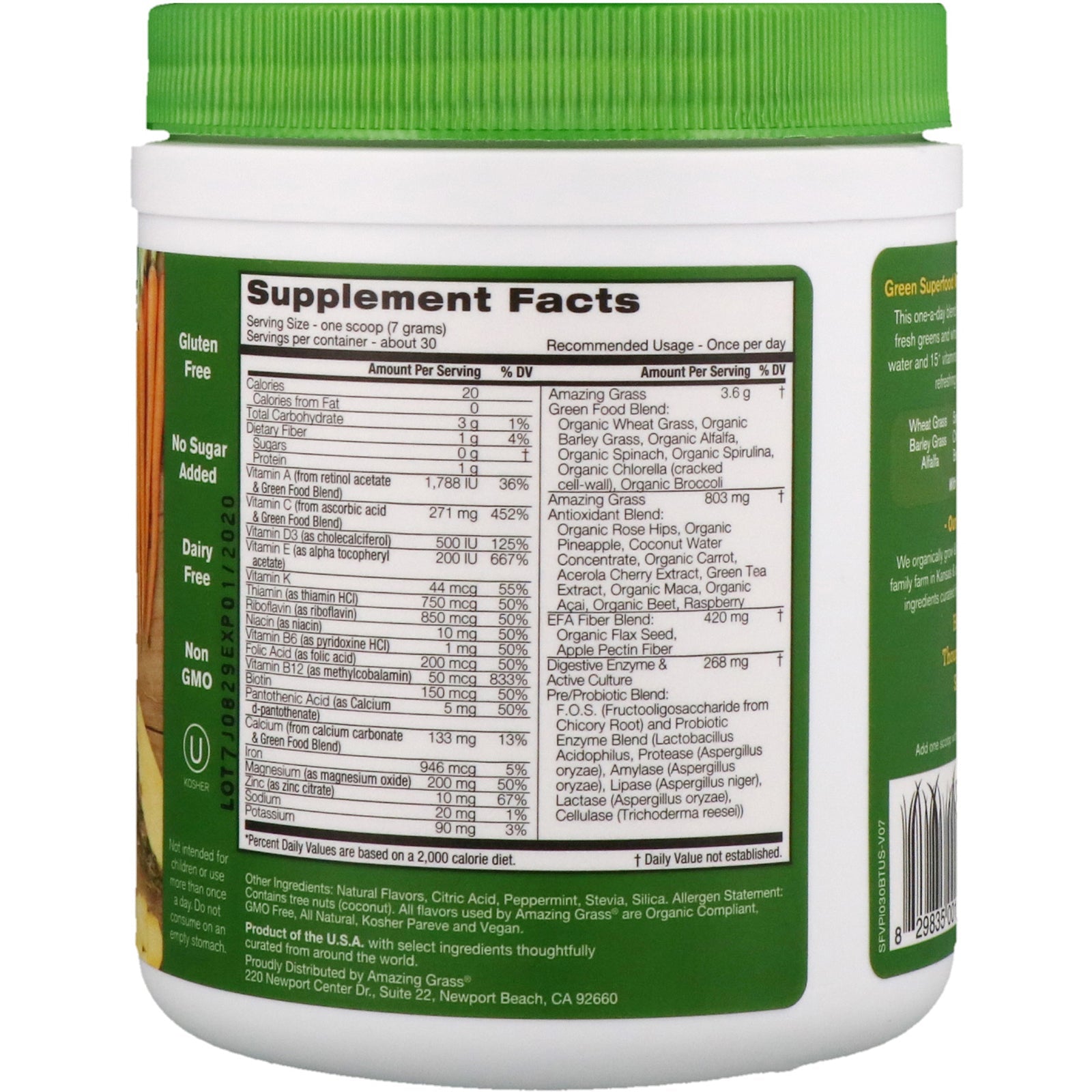 Serving Size: one scoop (7 grams) Servings Per Container: about 30 Amount Per Serving %DV Calories 20 Calories from Fat 0 Total Carbohydrate 3 g 1% Dietary Fiber 1 g 4% Sugars 0 g † Protein 1 g Vitamin A (from retinol acetate & Green Food Blend) 1,788 IU 36% Vitamin C (from ascorbic acid & Green Food Blend) 271 mg 452% Vitamin D3 (as cholecalciferol) 500 IU 125% Vitamin E (as alpha tocopheryl acetate) 200 IU 667% Vitamin K 44 mcg 55% Thiamin (as thiamin HCl) 750 mcg 50% Riboflavin (as riboflavin) 850 mcg 50% Niacin (as niacin) 10 mg 50% Vitamin B6 (as pyridoxine HCl) 1 mg 50% Folic Acid (as folic acid) 200 mcg 50% Vitamin B12 (as methylcobalamin) 50 mcg 833% Biotin 150 mcg 50% Pantothenic Acid (as Calcium d-pantothenate) 5 mg 50% Calcium (from calcium carbonate & Green Food Blend) 133 mg 13% Iron 946 mcg 5% Magnesium (as magnesium oxide) 200 mg 50% Zinc (as zinc citrate) 10 mg 67% Sodium 20 mg 1% Potassium 90 mg 3% Amazing Grass Green Food Blend: Organic Wheat Grass, Organic Barley Grass, Organic Alfalfa, Organic Spinach, Organic Spirulina, Organic Chlorella (cracked cell-wall), Organic Broccoli 3.6 g † Amazing Grass Antioxidant Blend: Organic Rose Hips, Organic Pineapple, Coconut Water Concentrate, Organic Carrot, Acerola Cherry Extract, Green Tea Extract, Organic Maca, Organic Acai, Organic Beet, Raspberry 803 mg † EFA Fiber Blend: Organic Flax Seed, Apple Pectin Fiber 420 mg † Digestive Enzyme & Active Culture Pre/Prebiotic Blend: F.O.S. (Fructooligosaccharide from Chicory Root) and Probiotic Enzyme Blend (Lactobacillus Acidophilus, Protease (Aspergillus oryzae), Amylase (Aspergillus oryzae), Lipase (Aspergillus niger), Lactase (Aspergillus oryzae), Cellulase (Trichoderma reesei)) 268 g † *Percent Daily Values are based on a 2,000 calorie diet. † Daily Value not established.Disclaimer