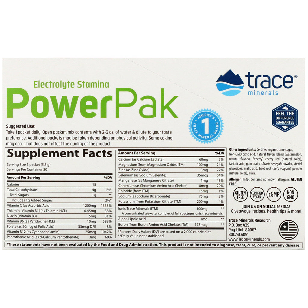 1,200 mg Vitamin C + Vitamins-Minerals Energy-Immunity - Hydration Dietary Supplement America's 1 Trace Mineral Brand Feel The Difference Guarantee Gluten Free Certified Vegan cGMP Non GMO #TraceYourTravels - #TraceYourDay When should I take PowerPak? Before during, and after your workout to help maintain healthy hydration levels and avoid muscle cramps After a hot day in the sun Every day to maintain energy, vitality, and a healthy immune system To avoid occasional sluggishness & fatigue Why is PowerPak better? Better formula: only 1 g sugar, and 200 mg more vitamin C than the leading brand. No caffeine, artificial flavors, or artificial stimulants Essential electrolytes: Sodium, Potassium, Calcium, Magnesium, and many more from Ionic Trace Minerals.