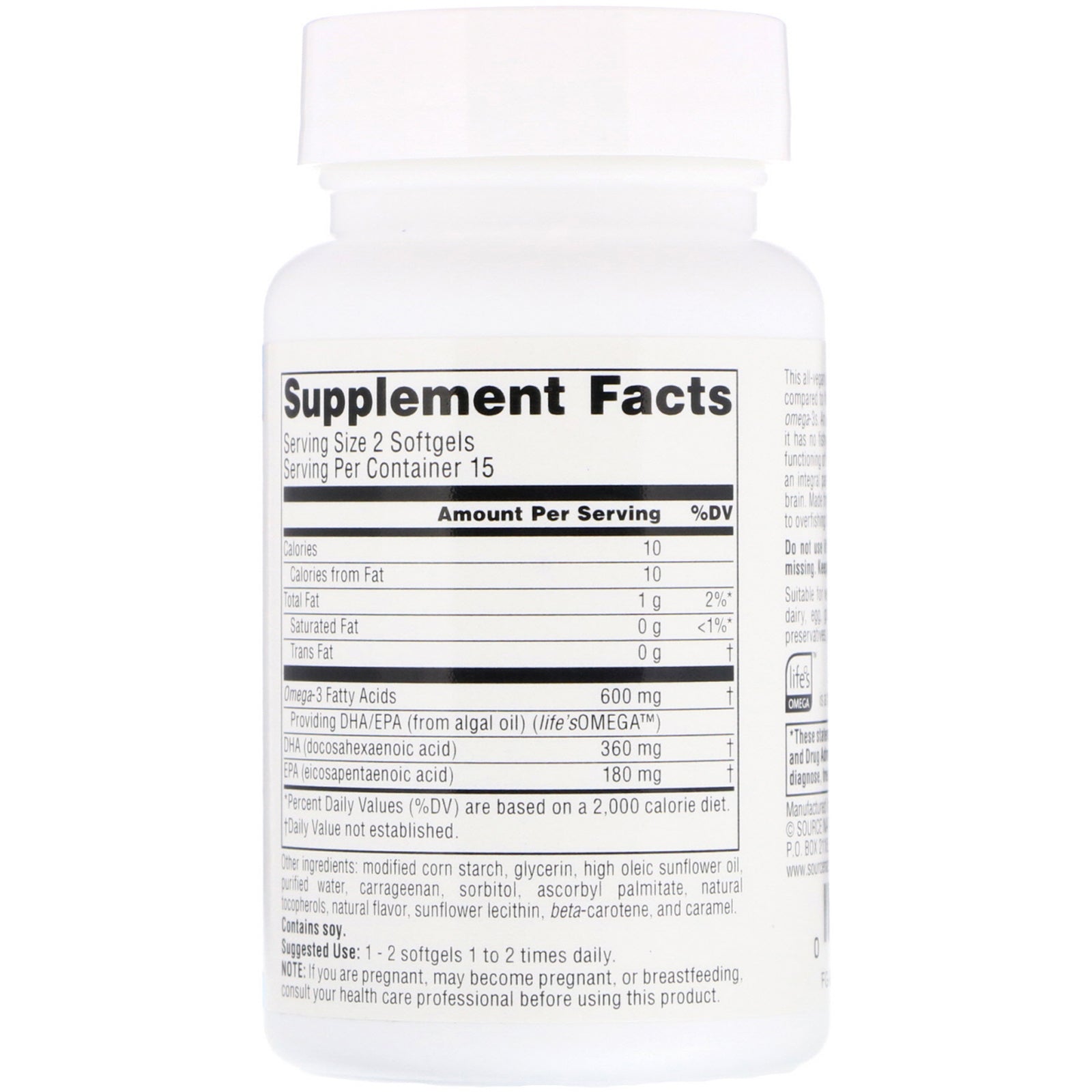 Omega-3S for Heart & Brain Health Dietary Supplement Fish Oil Alternative Life's DHA - Healthy Brain, Eyes, Heart This all-vegan product is a superior source of EPA and DHA compared to flax seed oil or other vegetarian sources of omega-3s. An exceptional vegetarian alternative to fish oil, it has no fishy aftertaste. EPA/DHA supports the healthy functioning of the brain and cardiovascular system. DHA is an integral part of neural membrane phospholipids in the brain. Made from algae, it is also a sustainable alternative to overfishing the oceans.Sugg. Use1-2 softgels 1 to 2 times daily.Other IngredientsModified corn starch, glycerin, high oleic sunflower oil, purified water, carrageenan, sorbitol, ascorbyl palmitate, natural tocopherols, natural flavor, sunflower lecithin, beta-carotene, and caramel. Contains soy. Suitable for vegans and vegetarians. Contains no yeast, dairy, egg, gluten or wheat. Contains no sugar, salt, preservatives, or artificial color, flavor or fragrance.Supplement FactsServing Size: 2 Softgels Serving Per...