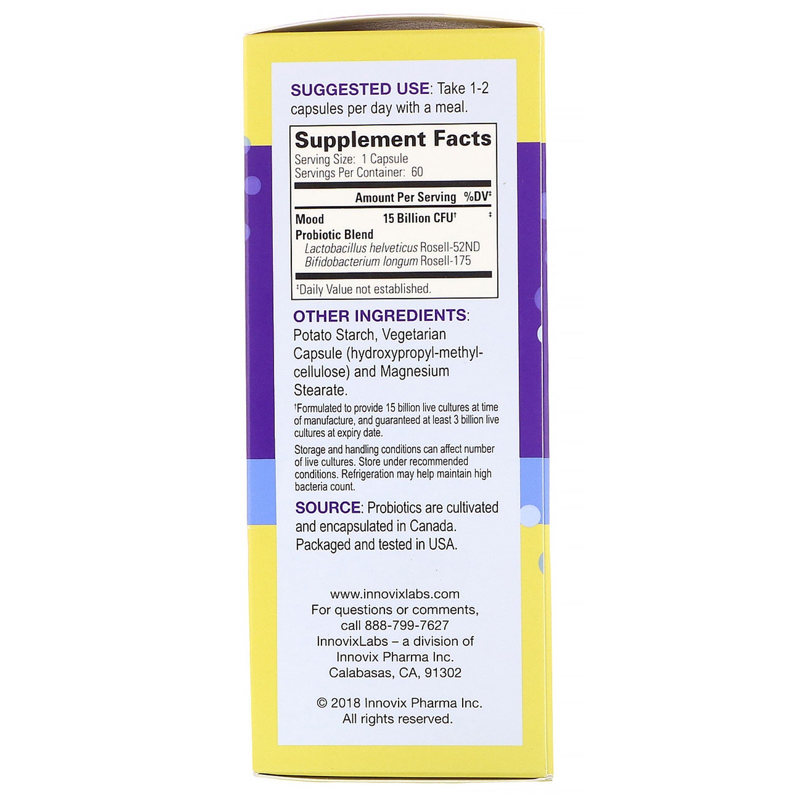 Mood Support Based on Clinical Research May Help Ease Physical and Psychological Symptoms of Stress May Help Support Positive Mood Balance Dietary Supplement New Discovery in Probiotic Science New research shows there may be a connection between gut health and mood. Probiotic bacteria in the gut can influence the function and behavior of the brain. This is called the 'gut-brain axis'†. The Unique Strains with Clinically Studied Benefits: Lactobacillus helveticus Rosell-52ND Bifidobacterium longum Rosell-175 Clinical research has shown that the unique probiotic blend used in InnovixLabs Mood Probiotic may help you: Cope better in stressful situations. Ease digestive discomfort associated with stress. Support positive mood and emotional wellness. Individual results may vary due to the severity of imbalance in gut bacteria, consistency of product use, or if causes are unrelated to gut health. Scientists have identified at least three mechanisms that may help explain the beneficial effect of probiotics on mood and emotions. 1. Probiotics can help reduce establishment of bad bacteria in gut. 2. Probiotics can help support healthy cytokine balance. 3. Probiotics can help support healthy communication with nervous system. Time For Effect: In clinical studies, those who noticed an effect required a month of regular use. Individual results may vary.