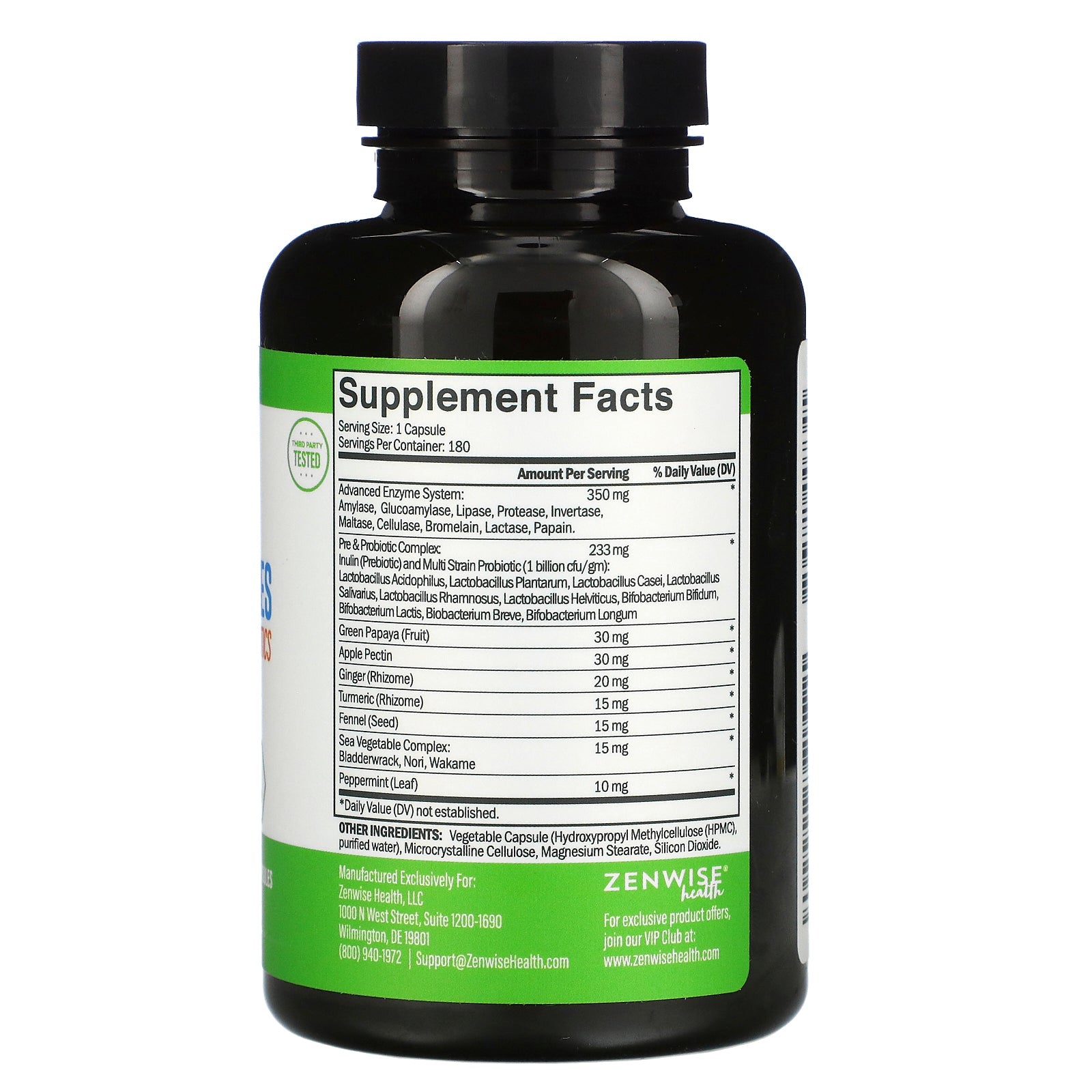 Third Party Tested Digestion - Comfort - Energy - Absorption - Immune + Plant-Sourced Blend Dietary Supplement With Enzymes, Prebiotics & Probiotics Supports Digestion for Stomach Comfort Promotes Proper Nutrient Uptake Optimizes Energy Levels Zenwise Health Digestive Enzymes contain a specialized blend of plant-sourced Enzymes, Prebiotics, and Probiotics that encourage daily digestive health for men and women. By helping the body digest fats, proteins, carbohydrates, and cellulose, this advanced formula has been shown to support healthy digestion, immune function, and balanced energy levels.Sugg. UseTake one capsule immediately before each meal, or as directed by a healthcare professional.Other IngredientsVegetable capsule (hydroxypropyl methylcellulose (hpmc), purified water), microcrystalline cellulose, magnesium stearate, silicon dioxide.Supplement FactsServing Size: 1 Capsule Servings Per Container: 180 Amount Per Serving %Daily Value Advanced Enzyme System: Amylase, Glucoamylase, Lipase, Protease, Invertase, Maltase, Cellulase, Bromelain, Lactase, Papain 350 mg * Pre & Probiotic Complex Inulin (Prebiotic) and Multi Strain Probiotic (1...