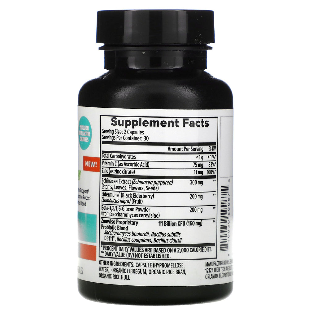 11 Billion Total Active Cultures Daily Immune-System Aid Immune Support Microbiome Boost Probiotic Blend Dietary Supplement Approximately 70% of the immune system resides in the gut to help block out unwanted intruders, so aid your gut and immune health with this dose of Echinacea, Elderberry, and Zinc. With Eldermune™ and 11 billion CFU's of clinically studies DE111® probiotic cultures, BlockAID™ is your daily aid to maintain well-being.Sugg. UseTake 2 capsules daily, with food.Other IngredientsCapsule (hypromellose, water), organic fibregum, organic rice bran, organic rice hull.Supplement FactsServing Size: 2 Capsules Serving Per Container: 30 Amount Per Serving %Daily Value Total Carbohydrates <1 g <1%* Vitamin C (as Ascorbic Acid) 75 mg 83%* Zinc (as zinc citrate) 11 mg 100%* Echinacea Extract (Echinacea purpure) (Stems, Leaves, Flowers, Seeds) 300 mg ** Eldermune™ (Black Elderberry) (Sambucus nigra) (fruit) 200 mg ** Beta-1,3/1, 6-Glucan Powder (from Saccharomyces cerevisiae) 200 mg ** Zenwise Proprietary Probiotic Blend...