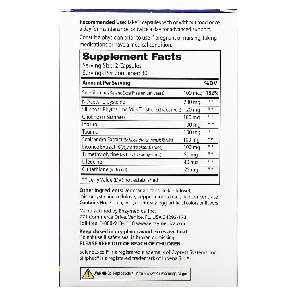Serving Size: 2 Capsules Servings Per Container: 30 Amount Per Serving %Daily Value† Selenium (as SelenoExcell® selenium yeast) 100 mcg 182% N-Acetyl-L-Cysteine 200 mg ** Siliphos® Phytosome Milk Thistle extract (fruit) 120 mg ** Choline (as bitartrate) 100 mg ** Inositol 100 mg ** Taurine 100 mg ** Schisandra Extract (Schisandra chinensis) (fruit) 100 mg ** Licorice Extract (Glycyrrhiza glabra) (root) 100 mg ** Trimethylglycine (as betaine anhydrous) 50 mg ** L-leucine 40 mg ** Glutathione (reduced) 25 mg ** **Daily Value not establishedDisclaimer