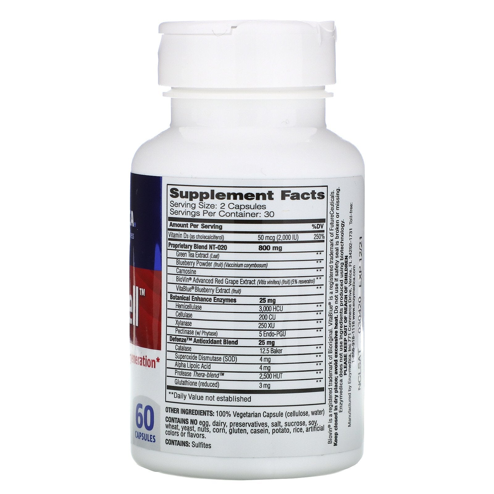 Serving Size: 2 Capsules Servings Per Container: 30 Amount Per Serving %DV† Vitamin D3 (as cholecalciferol) Vegetarian 2,000 IU 500% Proprietary Blend NT-020 800 mg Green Tea Extract (Leaf)(95% polyphenols) ** Blueberry Lowbush Powder (fruit) ** Carnosine ** BioVin Advanced Red Grape Extract (Vitis vinifera) (fruit) (5% Resveratrol) ** VitaBlue Wild Blueberry Extract (fruit) ** Botanical Enhance Enzymes 25 mg Hemicellulase 3,000 HCU ** Cellulase 200 CU ** Xylanase 250 XU ** Pectinase (w/ Phytase) 5 Endo-PGU ** Defenze Antioxidant Blend 25 mg Catalase 12.5 Baker ** Superoxide Dismutase (SOD) 4 mg ** Alpha Lipoic Acid 4 mg ** Protease Thera-blend 2,500 HUT ** Glutathione (reduced) 3 mg ** **Daily Value not established †Percent Daily Values are based on a 2,000 calorie dietDisclaimer
