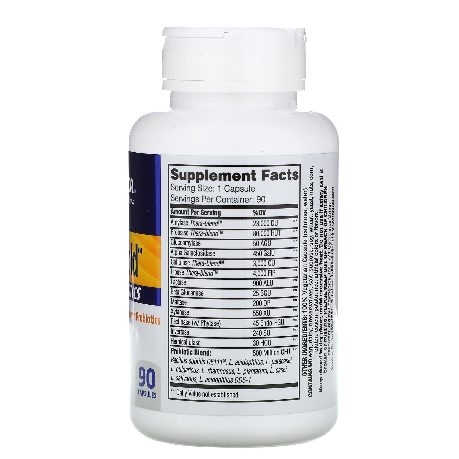 Serving Size: 1 Capsule Servings per Container: 90 Amount Per Serving %DV Amylase Thera-blend 23,000 DU ** Protease Thera-blend 80,000 HUT ** Glucoamylase 50 AGU ** Alpha Galactosidase 450 GALU ** Cellulase Thera-blend 3,000 CU ** Lipase Thera-blend 4,000 FCCFIP ** Lactase 900 ALU ** Beta Glucanase 25 BGU ** Maltase 200 DP ** Xylanase 550 XU ** Pectinase (w/ Phytase) 45 Endo-PGU ** Invertase 240 SU ** Hemicellulase 30 HCU ** Probiotic Blend: L- acidophilus DDS-1 , L. Rhamnosus, L. Casei, L. gasseri, L. Plantarum, L. Bulgaricus, L. Salivarius, L. Paracasei 500 million CFU ** ** Daily Value not established.Disclaimer