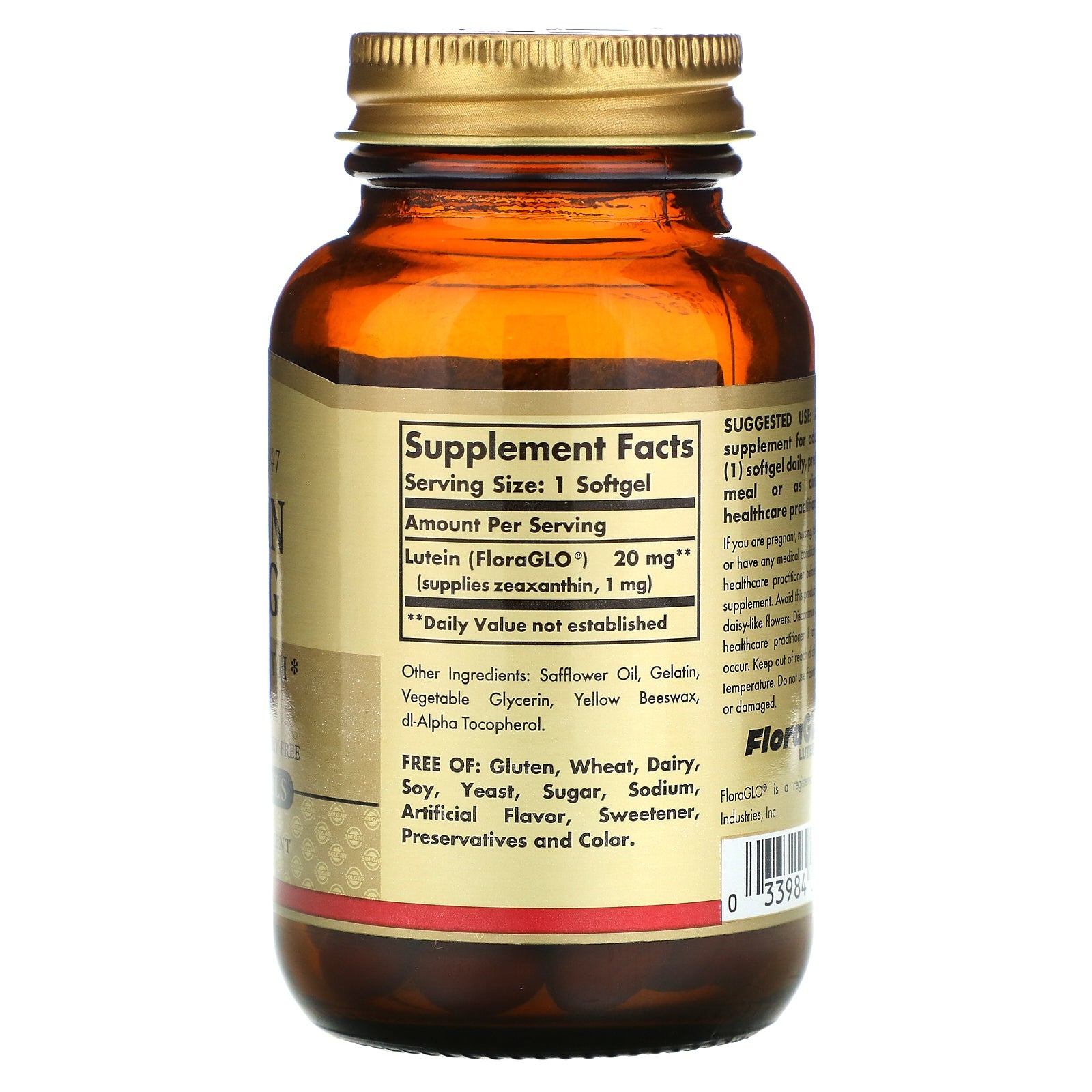 Since 1947 Eye Health Non-GMO Gluten, Wheat & Dairy Free Dietary Supplement FloraGLO Lutein® As we age, the body's natural supply of this vital carotenoid can decrease, especially if dietary intake is insufficient. Solgar® Lutein 20 mg nutritionally promotes and supports the health of your eyes.Sugg. UseAs a dietary supplement for adults, take one (1) softgel daily, preferably with a meal or as directed by a healthcare practitioner.Other IngredientsSafflower oil, gelatin, vegetable glycerin, yellow beeswax, dl-alpha tocopherol. Free of: Gluten, wheat, dairy, soy, yeast, sugar, sodium, artificial flavor, sweetener, preservatives and color.Supplement FactsServing Size: 1 Softgel Amount Per Serving %Daily Value Lutein (FloraGLO®) (supplies zeaxanthin, 1 mg) 20 mg ** **Daily Value not establishedDisclaimerWhile VitaminsUK strives to ensure the accuracy of its product images and information, some manufacturing changes to packaging and/or ingredients may be pending update on our site. Although items may occasionally ship with alternate packaging, freshness is...
