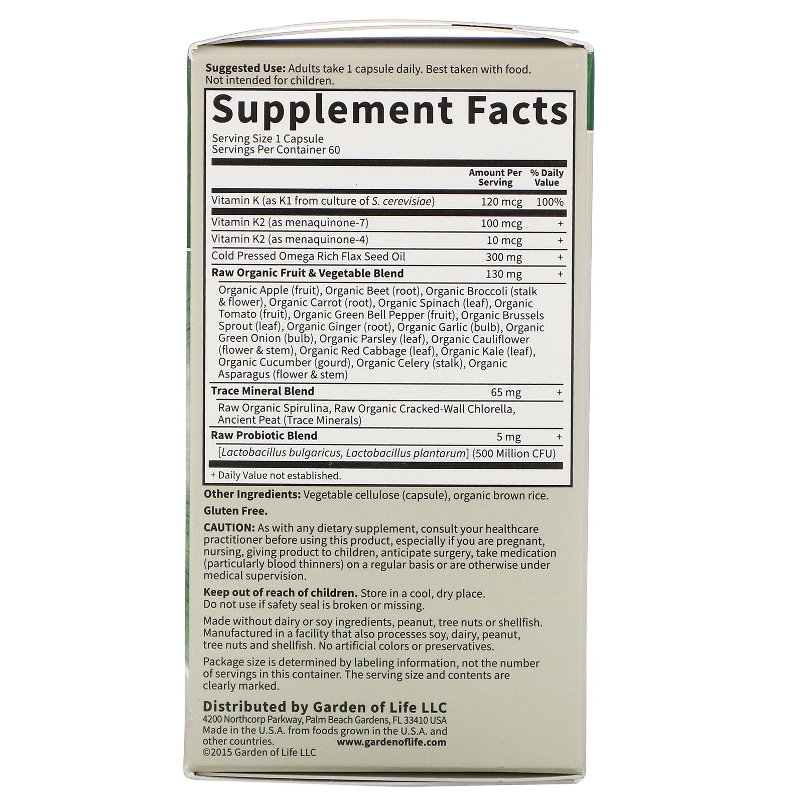 Serving Size: 1 Capsule Servings Per Container: 60 Amount Per Serving % Daily Value Vitamin K (as K1 from culture os S. cerevisiae) 120 mcg 100% Vitamin K2 (as menaquinone-7) 100 mcg + Vitamin K2 (as menaquinone-4) 10 mcg + Cold Pressed Omega Rich Flax Seed Oil 300 mg + Raw Organic Fruit & Veggie Mineral Blend Organic Apple (fruit), Organic Beet (root), Organic Broccoli (stalk & flower), Organic Carrot (root), Organic Spinach (leaf), Organic Tomato (fruit), Organic Green Bell Pepper (fruit), Organic Brussels Sprout (leaf), Organic Ginger (root), Organic Garlic (bulb), Organic Green Onion (bulb), Organic Parsley (leaf), Organic Cauliflower (flower & stem), Organic Red Cabbage (leaf), Organic Kale (leaf), Organic Cucumber (gourd), Organic Celery (stalk), Organic Asparagus (flower & stem) 130 mg + Trace Mineral Blend Raw Organic Spirulina, Raw Organic Cracked-Wall Chlorella, Ancient Peat (Trace Minerals) 65 mg + Raw Probiotic Blend [Lactobacillus bulgaricus, Lactobacillus plantarum] (500 Million CFU) 5 mg + +Daily Value not established.Disclaimer