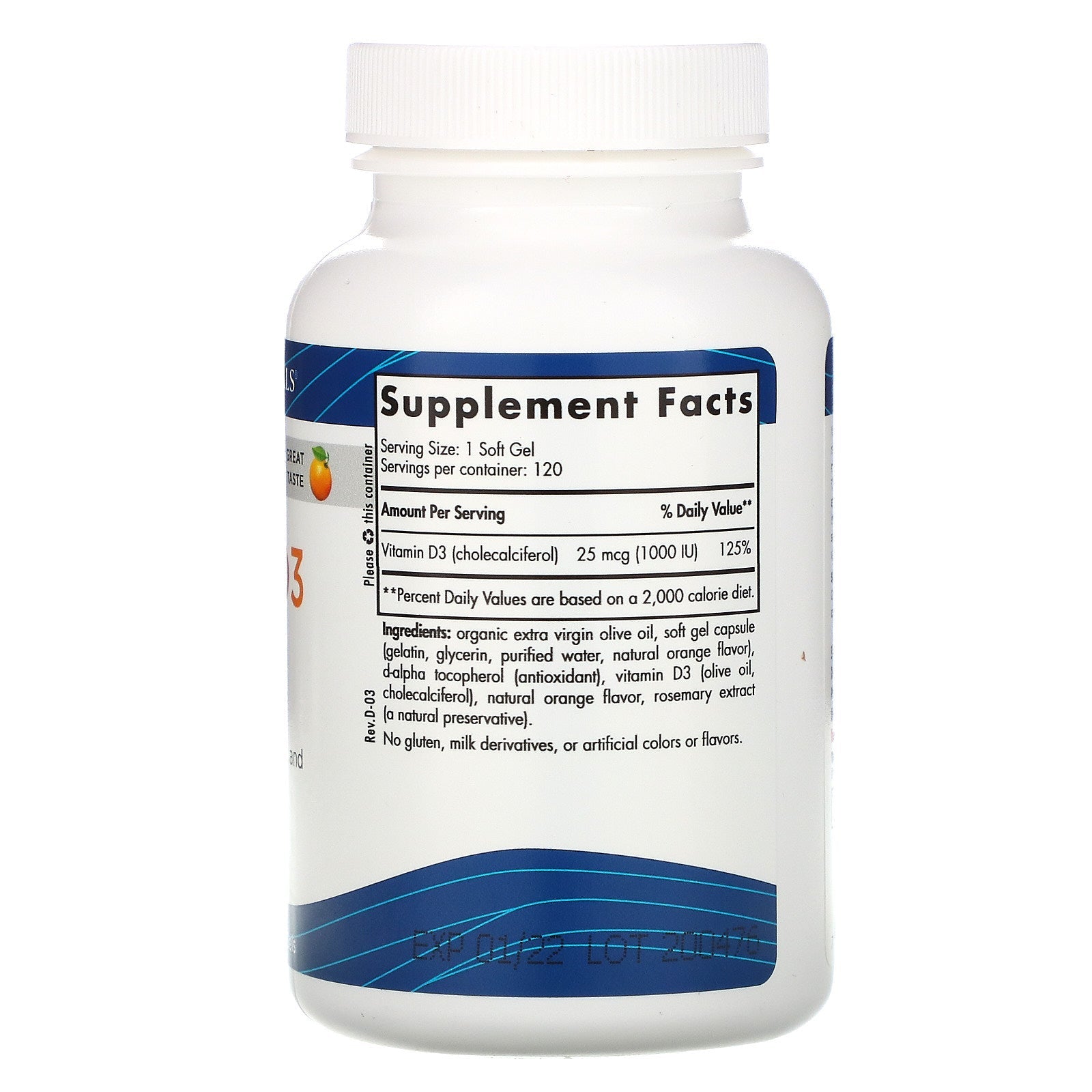 Bone Health Positive Mood Healthy Immunity Great Orange Taste! Non GMO Verified Third-Party Purity Tested Dietary Supplement Healthy bones, mood, and immune system function. Surpasses the Daily Value for Vitamin D Vitamin D has long been known for its important role in regulating calcium and phosphorus levels, and increasing mineralization in the bones. Nordic Naturals Vitamin D3 1000 is cholecalciferol, the natural, most easily absorbed and utilized form of vitamin D to support bone, mood, and immune health, and help regulate sleep rhythms. Each serving provides 1000 IU of vitamin D3 in organic extra virgin olive oil.Sugg. UseOne soft gel daily, with food, or as directed by your health care professional or pharmacist.Other IngredientsOrganic extra virgin olive oil, soft gel capsule (gelatin, glycerin, purified water, natural orange flavor), d-alpha tocopherol, vitamin D3 (cholecalciferol in olive oil), natural orange flavor, rosemary extract (a natural preservative). No gluten, milk derivatives, or artificial...