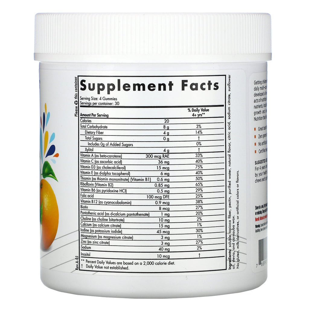 Serving Size: 4 Gummies Serving Per Container: 30 Amount Per Serving %Daily Value 4++yrs** Calories 20 Total Carbohydrate 8 g 3% Dietary Fiber 4 g 14% Total Sugars 0 g † Includes 0 g of Added Sugars 0% Xylitol 4 g † Vitamin A (as beta-carotene) 300 mcg RAE 33% Vitamin C (as ascorbic acid) 36 mg 40% Vitamin D3 (as cholecalciferol) 15 mcg 75% Vitamin E (as d-alpha tocopherol) 6 mg 40% Thiamin (as thiamin mononitrate) (Vitamin B1) 0.6 mg 50% Riboflavin (Vitamin B2) 0.85 mg 65% Vitamin B6 (as pyridoxine HCI) 0.5 mg 29% Folic acid 100 mcg DFE 25% Vitamin B12 (as cyanocobalamin) 0.9 mcg 38% Biotin 8 mcg 27% Pantothenic acid (as d-calcium pantothenate) 1 mg 20% Choline (as choline bitartrate) 15 mg 1% Calcium (as calcium citrate) 15 mg 1% Iodine (as potassium iodide) 45 mcg 30% Magnesium (as magnesium citrate) 3 mg 1% Zinc (as zinc citrate) 3 mg 27% Sodium 40 mg 2% Inositol 10 mcg † ** Percent Daily Values are based on a 2,000 calorie diet. †Daily Value not established.Disclaimer