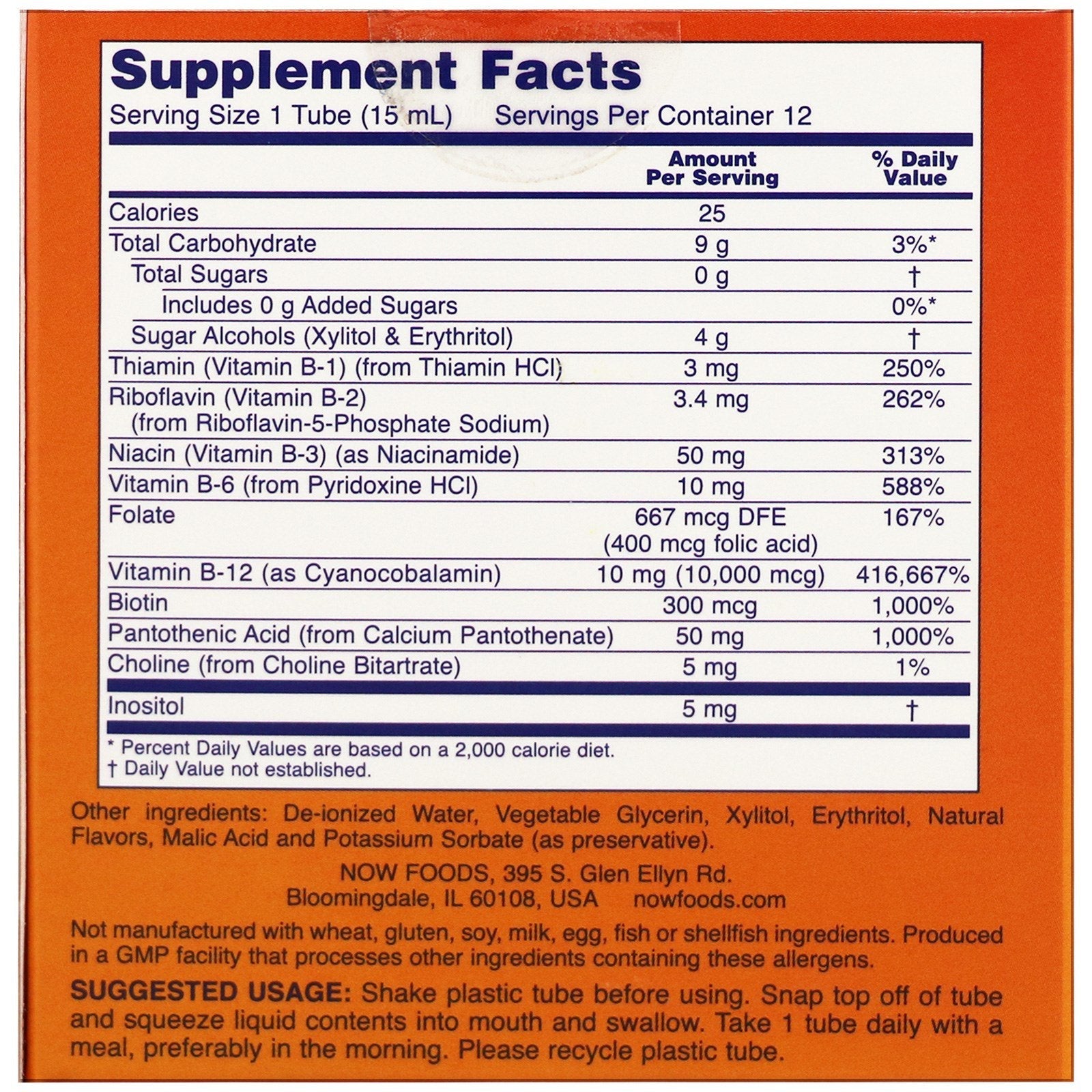Serving Size: 1 Tube (15 ml) Servings Per Container: 12 Amount Per Serving %Daily Value Calories 25 Total Carbohydrate 9 g 3%* Total Sugars 0 g † Includes 0 g of Added Sugars 0%* Sugar Alcohols (Xylitol & Erythritol) 4 g † Thiamin (Vitamin B-1) (from Thiamin HCL) 3 mg 250% Riboflavin (Vitamin B-2) (from Riboflavin-5-Phosphate Sodium) 3.4 mg 262% Niacin (Vitamin B-3) (as Niacinamide) 50 mg 313% Vitamin B-6 (from Pyridoxine HCL) 10 mg 588% Folate 667 mcg DFE (400 mcg folic acid) 167% Vitamin B-12 (as Cyanocobalamin) 10 mg (10,000 mcg) 416,667% Biotin 300 mcg 1,000% Pantothenic Acid (from Calcium Pantothenate) 50 mg 1,000% Choline (from Choline Bitartrate) 5 mg 1% Inositol 5 mg † * Percent Daily Values are based on a 2,000 calorie diet. † Daily Value not established.Disclaimer