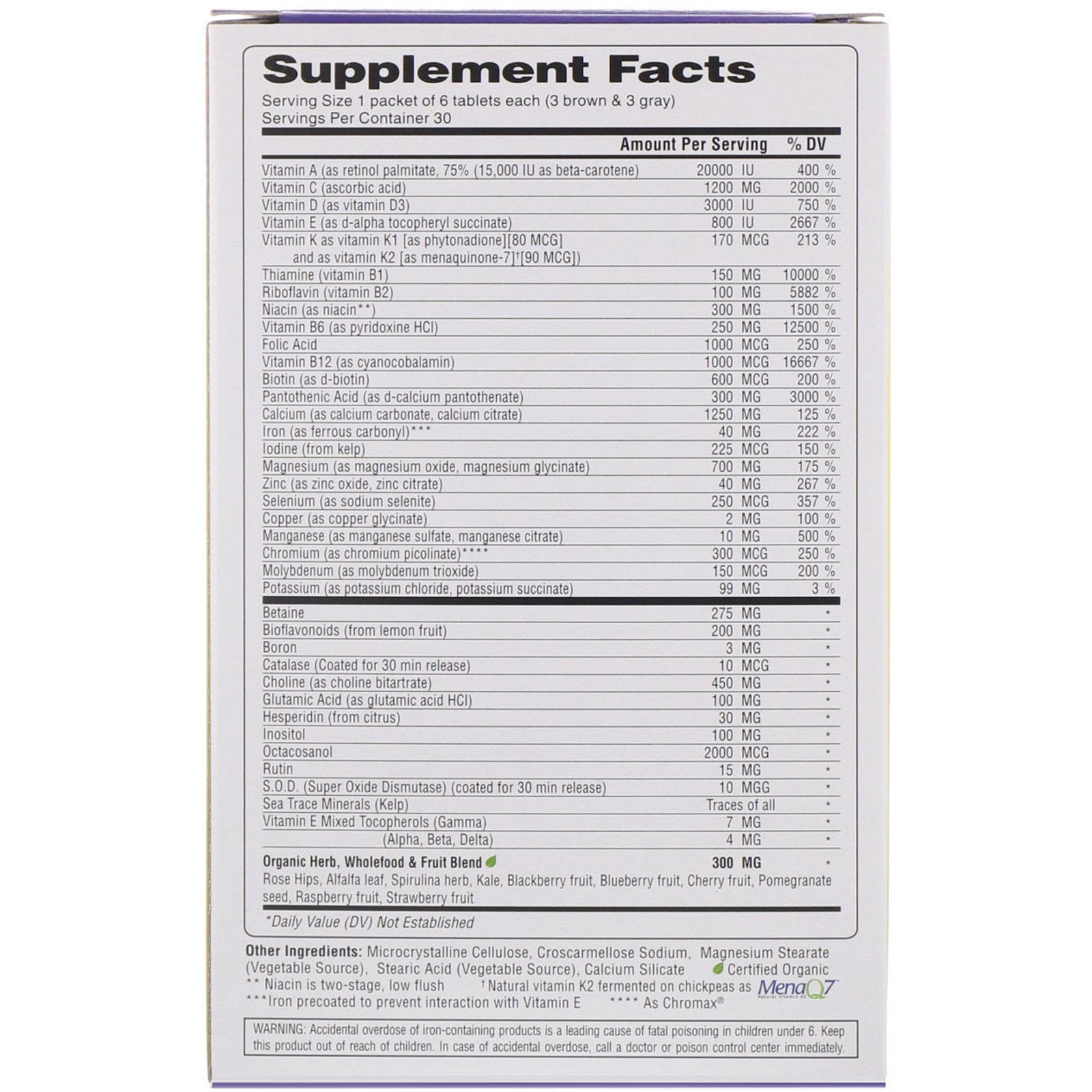Serving Size: 1 Packet of 6 Tablets Each (3 Gray and 3 Brown) Serving Per Container: 30 Amount Per Serving %DV Vitamin A (as retinol palmitate, 75% (15,000 IU as beta-carotene) 20000 IU 400% Vitamin C (Ascorbic Acid) 1200 mg 2000% Vitamin D (as Vitamin D3) 3000 IU 750% Vitamin E (as d-alpha tocopheryl succinate) 800 IU 2667% Vitamin K as Vitamin K1 [as Phytonadione] [80 mcg] and as vitamin K2 [as menaquinone-7]† [90 mcg]) 170 mcg 213% Thiamine (Vitamin B1) 150 mg 10000% Riboflavin (Vitamin B2) 100 mg 5882% Niacin (as niacin**) 300 mg 1500% Vitamin B6 (as Pyridoxine HCL) 250 mg 12500% Folic Acid 1000 mcg 250% Vitamin B12 (as cyanocobalamin) 1000 mcg 16667% Biotin (d-Biotin) 600 mcg 200% Pantothenic Acid (as D-Calcium Pantothenate) 300 mg 3000% Calcium (as Calcium Carbonate, Calcium Citrate) 1250 mg 125% Iron (as Ferrous Carbonyl)*** 40 mg 222% Iodine (From Kelp) 225 mcg 150% Magnesium (as Magnesium Oxide, Magnesium Glycinate) 700 mg 175% Zinc (as Zinc Oxide, Zinc Citrate) 40 mg 267% Selenium (as Sodium Selenite) 250 mcg 357% Copper (as Copper Glycinate) 2 mg 100% Manganese (as Manganese Sulfate, Manganese Citrate) 10 mg 500% Chromium (as Chromium Picolinate)**** 300 mcg 250% Molybdenum (as Molybdenum Trioxide) 150 mcg 200% Potassium (as Potassium Chloride, Potassium Succinate) 99 mg 3%Disclaimer