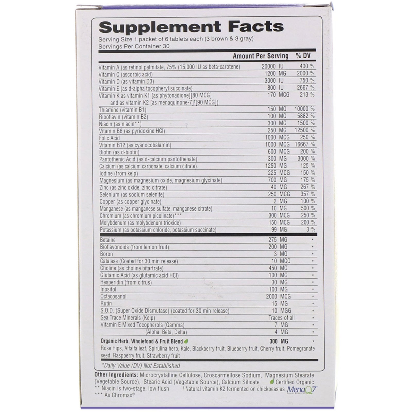 Serving Size: 1 packet of 6 tablets each (3 brown and 3 gray) Serving Per Container: 30 Amount Per Serving %DV Vitamin A (as retinol palmitate, 75% (15,000 IU as beta-carotene) 20000 IU 400% Vitamin C (ascorbic acid) 1200 mg 2000% Vitamin D (as vitamin D3) 3000 IU 750% Vitamin E (as d-alpha tocopheryl succinate) 800 IU 2667% Vitamin K as vitamin K1 [as phytonadione] [80 mcg] and as vitamin K2 [as menaquinone-7]†[90 mcg]) 170 mcg 213% Thiamine (vitamin B1) 150 mg 10000% Riboflavin (vitamin B2) 100 mg 5882% Niacin (as niacin**) 300 mg 1500% Vitamin B6 (as Pyridoxine HCL) 250 mg 12500% Folic Acid 1000 mcg 250% Vitamin B12 (as cyanocobalamin) 1000 mcg 16667% Biotin (as d-biotin) 600 mcg 200% Pantothenic Acid (as d-calcium pantothenate) 300 mg 3000% Calcium (as calcium carbonate, calcium citrate) 1250 mg 125% Iodine (from kelp) 225 mcg 150% Magnesium (as magnesium oxide, magnesium glycinate) 700 mg 175% Zinc (as zinc oxide, zinc citrate) 40 mg 267% Selenium (as sodium selenite) 250 mcg 357% Copper (as copper glycinate) 2 mg 100% Manganese (as manganese sulfate, manganese citrate) 10 mg 500% Chromium (as chromium picolinate)*** 300 mcg 250% Molybdenum (as molybdenum trioxide) 150 mcg 200% Potassium (as potassium chloride, potassium succinate) 99 mg 3%Disclaimer