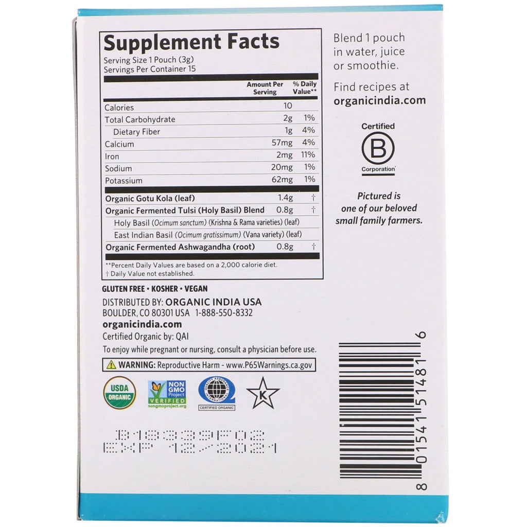 Serving Size: 1 pouch (3 g) Serving Per Container: 15 Amount Per Serving %Daily Value Calories 10 Total Carbohydrate 2 g 1% Dietary Fiber 1 g 4% Calcium 57 mg 4% Iron 2 mg 11% Sodium 20 mg 1% Potassium 62 mg 1% Gotu Kola (leaf) 1.4 g † Fermented Tulsi (Holy Basil) Blend 0.8 g † Holy Basil (Ocimum sanctum)(Krishna & Rama varieties) (leaf) East Indian Basil (Ocimum gratissimum)(Vana variety)(leaf) Fermented Ashwagandha (root) 0.8 g † ** Percent Daily Values are based on a 2,000 calorie diet. † Daily Value not established.Disclaimer