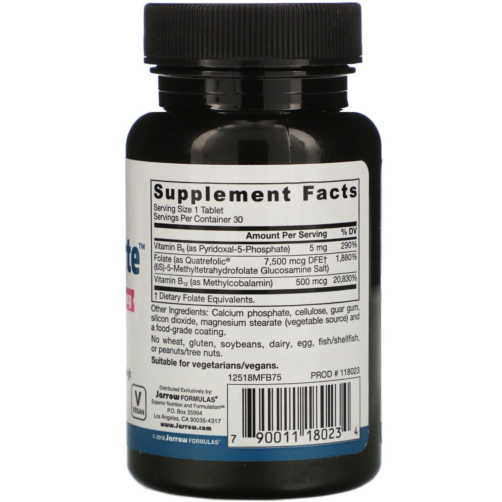 Methyl Folate - 7,500 mcg + Methyl B12 - 500 mcg + P-5-P (B6) - 5 mg Promotes Cardiovascular Function, Neurologic Health and Metabolism of Homocysteine Dietary Supplement Vegan Suitable for Vegetarians/Vegans Quatrefolic® Jarrow Formulas® Folate Forte™ with Methyl Folate plus Methyl B12 and Pyridoxal-5-Phosphate (P-5-P) combines the active forms of folate, B6 and vitamins B12 to support DNA and neurotransmitter synthesis, amino acid metabolism and healthy mood.Sugg. UseTake 1 tablet per day or as directed by your qualified healthcare professional.Other IngredientsCalcium phosphate, cellulose, guar gum, silicon dioxide, magnesium stearate (vegetable source) and a food-grade coating. No wheat, gluten, soybeans, dairy, egg, fish/shellfish or peanuts/tree nuts.Supplement FactsServing Size: 1 Capsule Serving Per Container: 30 Amount Per Serving %Daily Value Vitamin B6 (as pyridoxal-5-phosphate) 5 mg 290% Folate (as Quatrefolic® (6S)-Methyltetrahydrofolate Glucosamine Salt) 7,500 mcg DFE† 1,880% Vitamin B12 (as Methylcobalamin) 500 mcg 20,830% † Dietary Folate Equivalents.DisclaimerWhile VitaminsUK strives to...