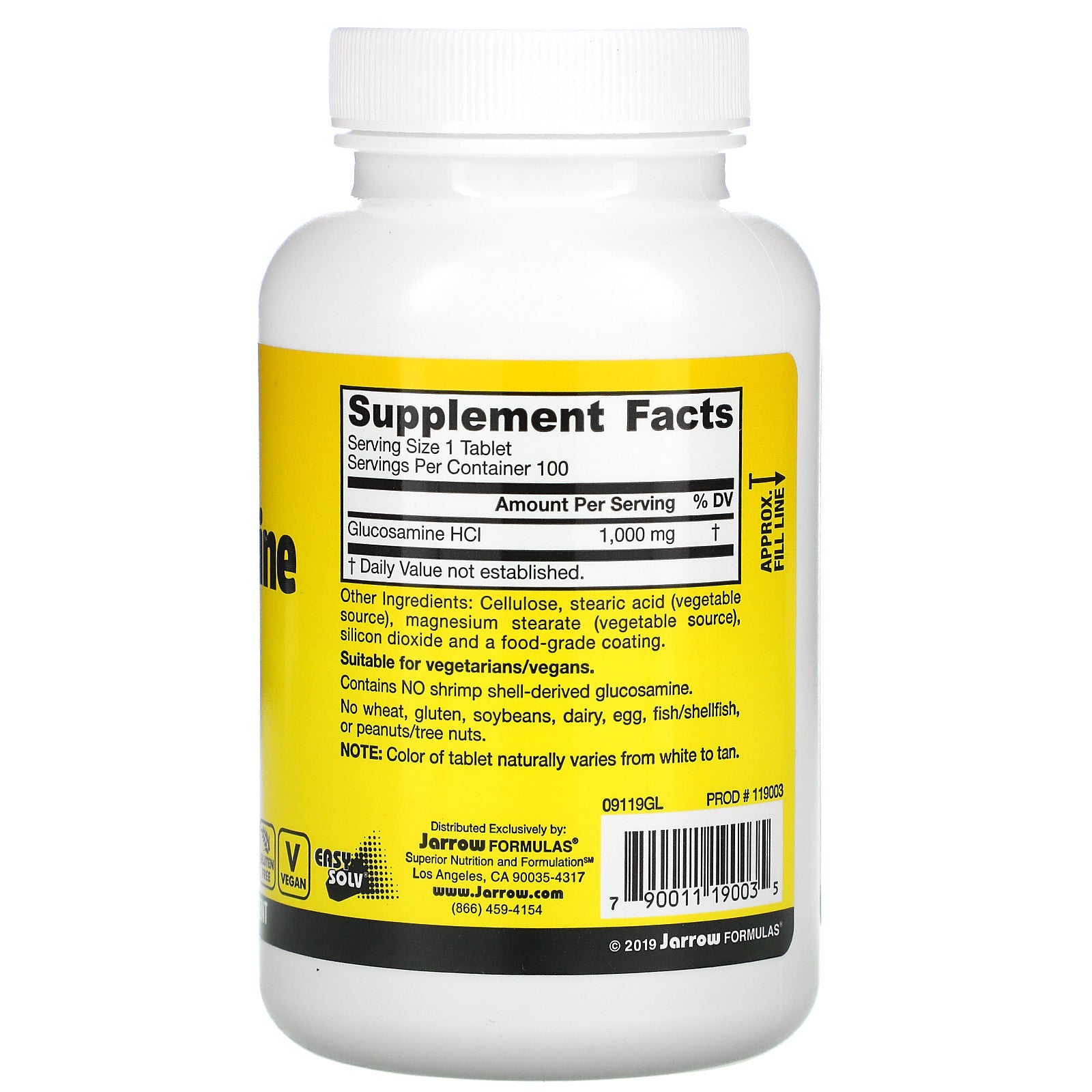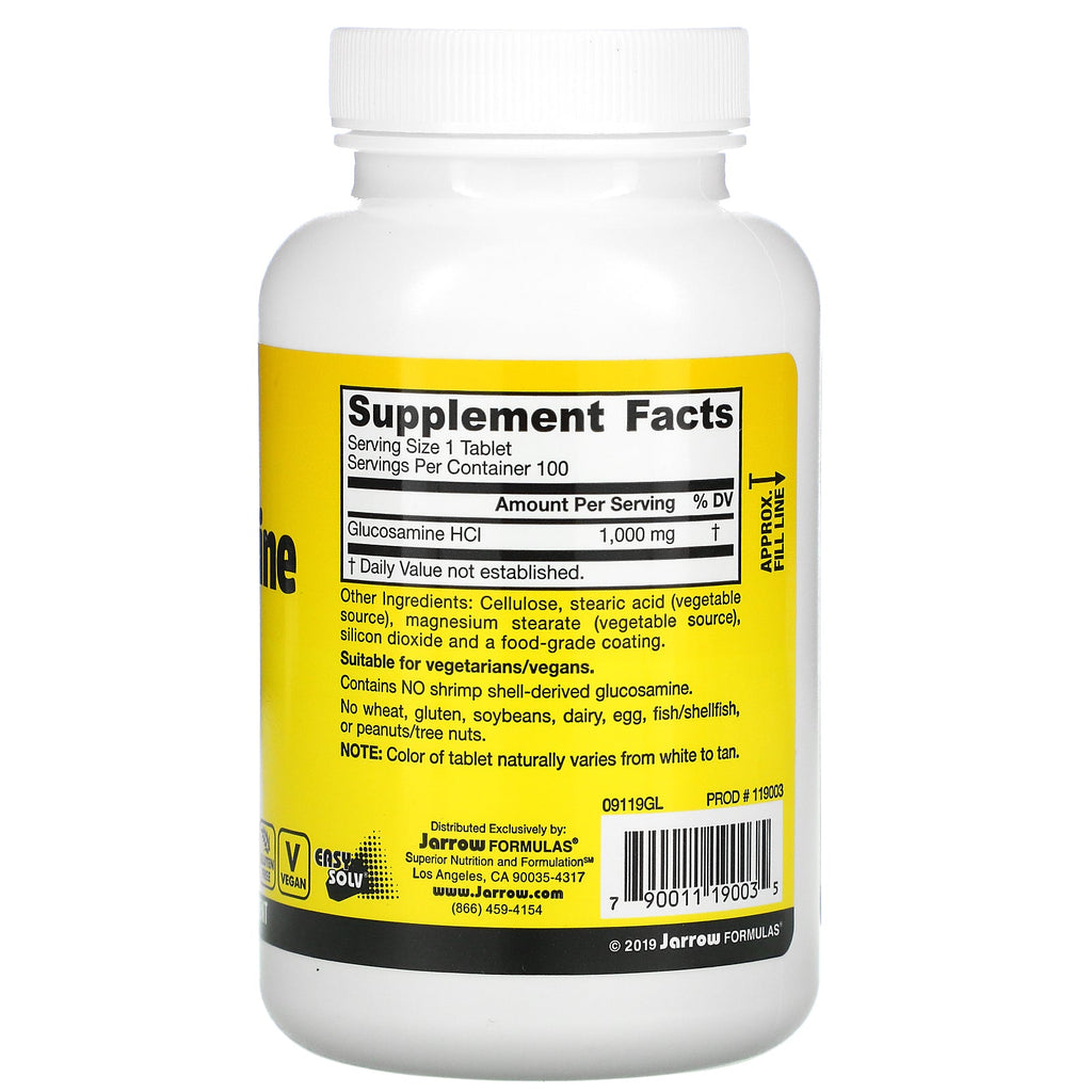 Glucosamine Hydrochloride Supports Healthy Joints & Connective Tissue Dietary Supplement Gluten Free Vegan EasySolv® Suitable for Vegetarians/Vegans The glucosamine in Jarrow Formulas ® Glucosamine HCI Mega is an aminosaccharide bound to HCI (hydrochloric acid). Glucosamine is a component of joint and intestinal tissue and is involved in the production of synovial fluid, which lubricates the joints. Glucosamine is converted to N-acetyl-glucosamine in the intestines by the goblet cells. Glucosamine HCL is Salt Free. Jarrow Formulas ® Glucosamine HCI Mega is a Sodium Free form of glucosamine.Sugg. UseTake 1 tablet 1 or 2 times per day or as directed by your qualified healthcare professional. Jarrow Formulas ® Glucosamine HCI Mega is completely vegetarian/vegan; the glucosamine is made by microbiological fermentation. For best results, use with Jarrow Formulas ® JarroSil ® , the biologically Activated Silicon ® .Other IngredientsCellulose, stearic acid (vegetable source), magnesium stearate (vegetable source), silicon dioxide and a food-grade...