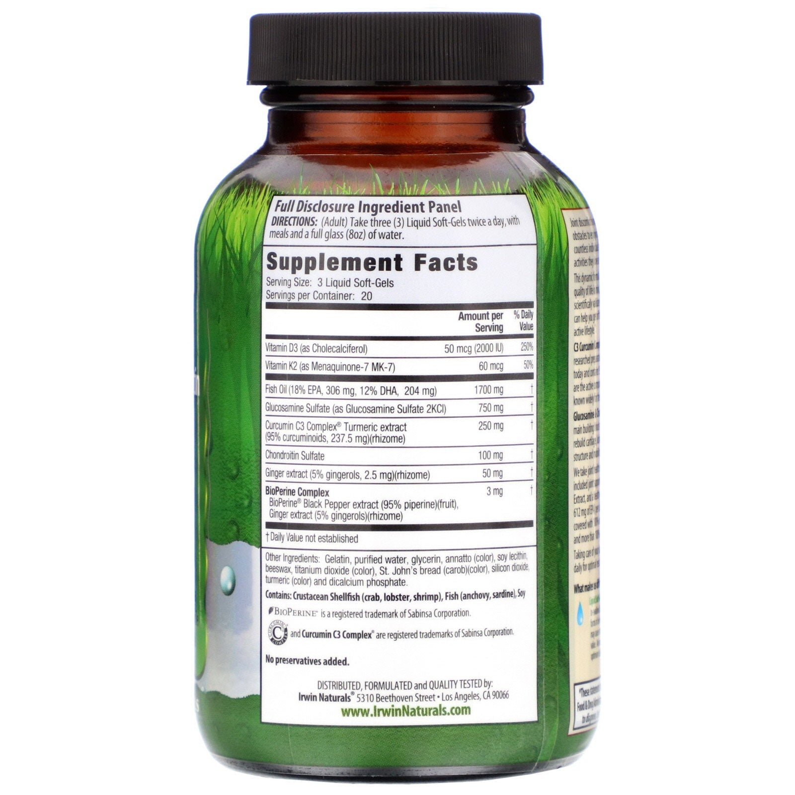 Dietary Supplement Powerful and Effective Formula to Help Lubricate and Soothe while Supporting Overall Joint Health. Joint discomfort is one of the most significant obstacles to enjoying quality of life as it prevents countless individuals from participating in the activities they love and value the most. This dynamic formula was designed with your quality of life in mind and features some of the most scientifically validated joint supportive nutrients that can help you get off the sidelines, and back into an active lifestyle. C3 Curcumin Complex is the most clinically researched preparation of Turmeric root known today and contains 95% total curcuminoids which are the active components of the Turmeric root known widely for their health promoting benefits. Glucosamine & Chondroitin are some of the main building blocks of joint tissue and help to rebuild cartilage, lubricate joints, and maintain joint structure and mobility. We take joint health seriously and that's why we've included joint supportive nutrients such as Ginger Extract, and a healthy dose of Fish Oil (delivering 612 mg of EPA) per daily serving. Plus, we've got you covered with 100% of your daily vitamin K2 needs and more than 100% of your daily vitamin D3 needs. Taking care of your joints just got a little easier. Use daily for optimal results. What makes us different: Liquid Soft-Gels - The nutrients in these easy-to-swallow Liquid Soft-Gels are released fast. Other forms of delivery can contain binders and fillers that may cause stomach upset and offer no nutritional value. Advanced Liquid Soft-Gels provide an optimum delivery system. Quality Assurance - Irwin Naturals is committed to providing the highest quality products for your health. We employ compliance testing to ensure purity and potency. Patented BioPerine - Our special BioPerine Complex enhances the bioavailability, absorption and potency of many nutrients.