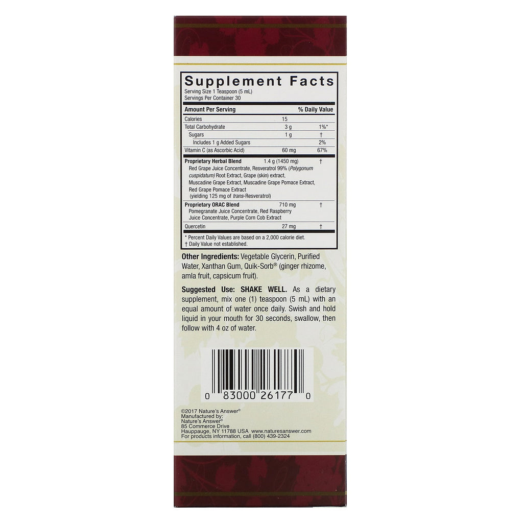 Serving Size: 1 Teaspoon (5 ml) Servings Per Container: 30 Amount Per Serving % Daily Value Calories 15 Total Carbohydrate 3 g 1%* Sugars 1 g † Includes 1 g Added Sugars 2% Vitamin C (as Ascorbic Acid) 60 mg 67% Proprietary Herbal Blend Red Grape Juice Concentrate, Resveratrol 99% (Polygonum cuspidatum) Root Extract, Grape (skin) extract, Muscadine Grape Extract, Muscadine Grape Pomace Extract, Red Grape Pomace Extract (yielding 12 mg of trans-Resveratrol) 1.4 g (1450 mg) † Proprietary ORAC Blend (Pomegranate Juice Concentrate, Red Raspberry Juice Concentrate, Purple Corn Cob Extract) 710 mg † Quercetin 27 mg † * Percent Daily Values are based on a 2,000 calorie diet. † Daily Value not established.Disclaimer