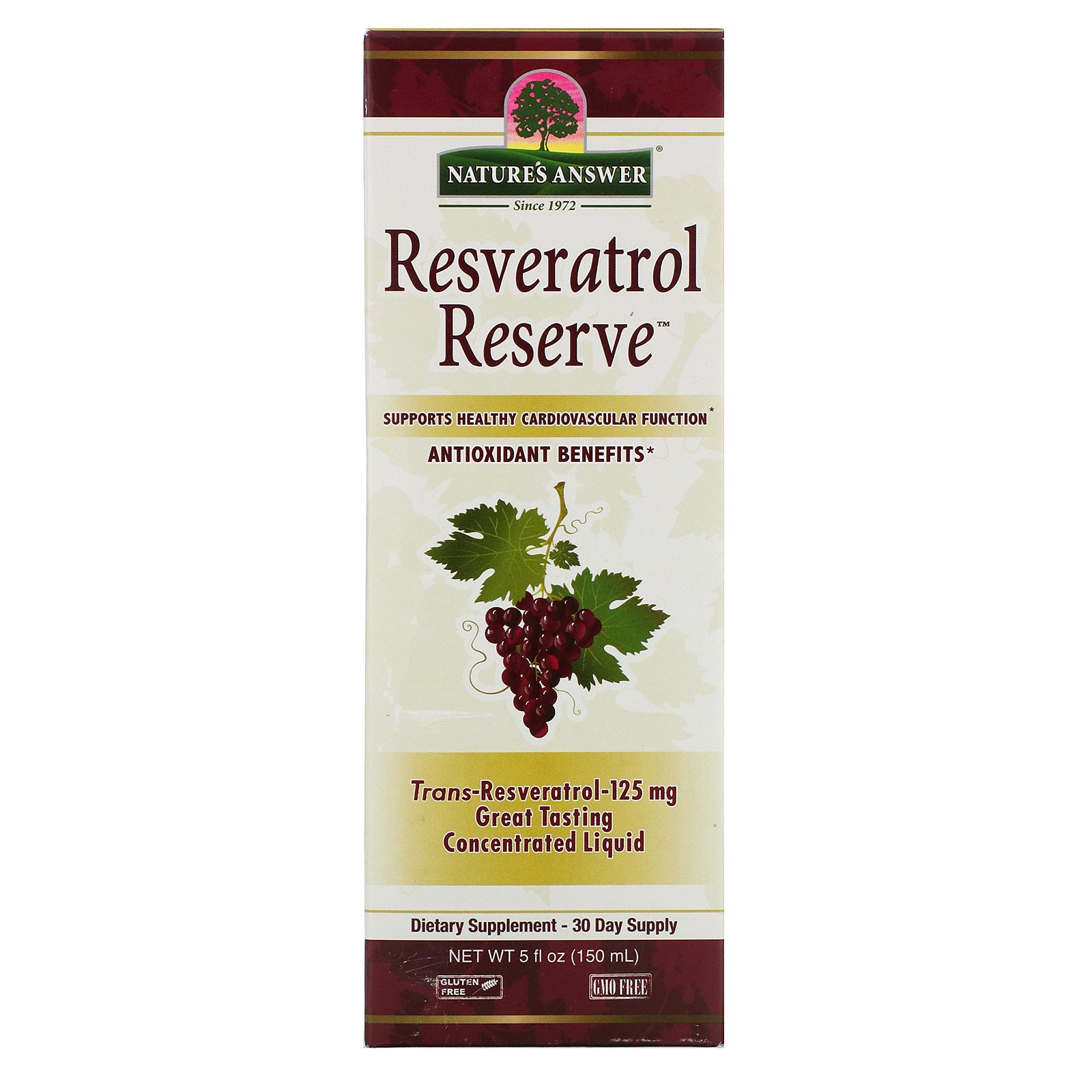Since 1972 Trans-Resveratrol Concentrated Liquid Supports Healthy Cardiovascular Function Antioxidant Benefits Trans-Resveratrol-125 mg Great Tasting Concentrated Liquid Dietary Supplement - 30 Day Supply Gluten Free GMO Free Premium Botanica Ingredients Including Muscadine Grape Extract Supplies 125 mg Trans-Resveratrol No Preservatives No Artificial Sweeteners No Artificial Flavors or Coloring No Wheat, Gluten, Yeast, Salt or Dairy Products No Benzoates or Sorbates Resveratrol Reserve™ from Nature's Answer® is the most technologically advanced Resveratrol available on the mark. We use only the purest ingredients obtainable. Nature's Answer®, the pioneer in herbal extracts, continues to set the industry stand for superior quality liquid extracts since 1972. We combine the most biologically active, highly purified form of Resveratrol, 99% pure trans-resveratrol, along with other delicious high oral 'superfruits" to bring you the top level, premier quality resveratrol available on the market: Resveratrol Reserve™! Resveratrol is a chemical constituent that has been isolated from grapes, red wine, blueberries, red berries, and Japanese Knotweed. Muscadine is the species of grape (berry) known to have the highest concentration of ellagic acid and anthocyanins. Nature's Answer® extracts only fresh whole muscadine grape (berries) in our own state-of-the-art extract facility in the U.S.A. to bring you the highest quality extract available. Resveratrol has created a buzz in the scientific community. Nature's Answer® Resveratrol Reserve™ is super concentrated so that you can reap the healthful benefits of resveratrol. One teaspoon (5 mL) serving supplies 125 mg of trans-resveratrol.