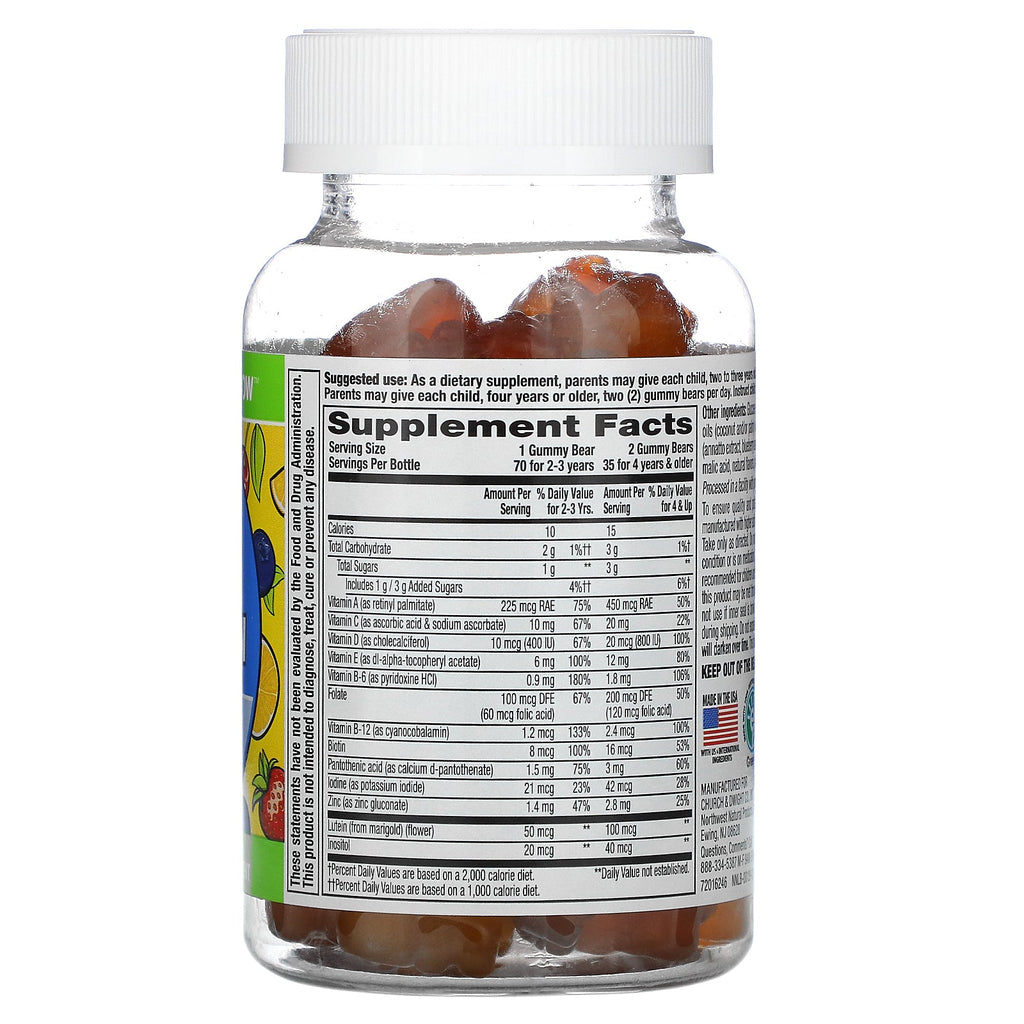 Serving Size: 1 Gummy Bear / 2 Gummy Bears Servings Per Container: 70 for 2-3 years / 35 for 4 years & older Amount Per Serving % Daily Value for 2-3 Yrs. Amount Per Serving % Daily Value for 4 & Up Calories 10 15 Total Carbohydrate 2 g 1%†† 3 g 1%† Total Sugars 1 g ** 3 g ** Includes Added Sugars 1 g 4%†† 3 g 6%† Vitamin A (as retinyl palmitate) 225 mcg RAE 75% 450 mcg RAE 50% Vitamin C (as ascorbic acid and sodium ascorbate) 10 mg 67% 20 mg 22% Vitamin D (as cholecalciferol) 10 mcg (400 IU) 67% 20 mcg (800 IU) 100% Vitamin E (as d-alpha tocopheryl acetate) 6 mg 100% 12 mg 80% Vitamin B-6 (as pyridoxine HCl) 0.9 mg 180% 1.8 mg 106% Folate 100 mcg DFE (60 mcg folic acid) 67% 200 mcg DFE (120 mg folic acid) 50% Vitamin B-12 (as cyanocobalamin) 1.2 mcg 133% 2.4 mcg 100% Biotin 8 mcg 100% 16 mcg 53% Pantothenic Acid (as calcium d-pantothenate) 1.5 mg 75% 3 mg 60% Iodine (as potassium iodide) 21 mcg 23% 42 mcg 28% Zinc (as zinc gluconate) 1.4 mg 47% 2.8 mg 25% Lutein (from marigold) (flower) 50 mcg ** 100 mcg ** Inositol 20 mcg ** 40 mcg ** † Percent Daily Values are based on a 2,000 calorie diet. ††Percent Daily Values are based on a 1,000 calorie diet. ** Daily Value not established.Disclaimer