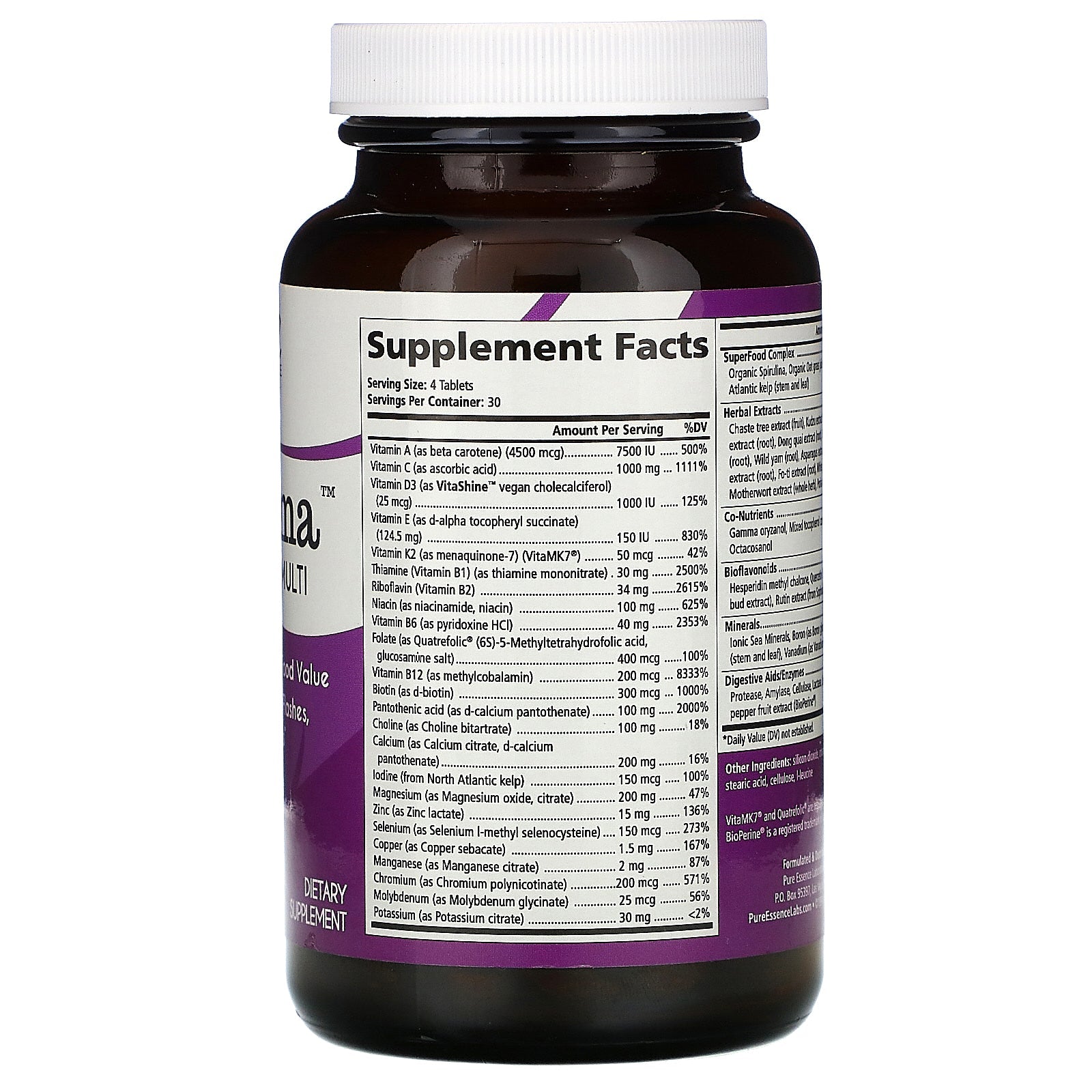 Serving Size: 4 Tablets Servings Per Container: 30 Amount Per Serving %Daily Value Vitamin A (as beta carotene) (4500 mcg) 7500 IU 500% Vitamin C (as ascorbic acid) 1000 mg 1111% Vitamin D3 (as VitaShine ™ vegan cholecalciferol) (25 mcg) 1000 IU 125% Vitamin E (as d-alpha tocopheryl succinate) (124.5 mg) 150 IU 830% Vitamin K2 (as menaquinone-7) (VitaMK7 ® ) 50 mcg 42% Thiamine (Vitamin B1) (as thiamine mononitrate) 30 mg 2500% Riboflavin (Vitamin B2) 34 mg 2615% Niacin (as niacinamide, niacin) 100 mg 625% Vitamin B6 (as pyridoxine HCI) 40 mg 2353% Folate (as Quatrefolic ® (6S)-5-Methyltetrahydrofolic acid, glucosamine salt) 400 mcg 100% Vitamin B12 (as methylcobalamin) 200 mcg 8333% Biotin (as d-biotin) 300 mcg 1000% Pantothenic acid (as d-calcium pantothenate) 100 mg 2000% Choline (as Choline bitartrate) 100 mg 18% Calcium (as Calcium citrate, d-calcium pantothenate) 200 mg 16% Iodine (from North Atlantic kelp) 150 mcg 100% Magnesium (as Magnesium oxide, citrate) 200 mg 47% Zinc (as zinc lactate) 15 mg 136% Selenium (as Selenium l-methyl selenocysteine) 150 mcg 273% Copper (as Copper sebacate) 1.5 mg 167% Manganese (as Manganese citrate) 2 mg 87% Chromium (as Chromium polynicotinate) 200 mcg 571% Molybdenum (as Molybdenum glycinate) 25 mcg 56% Potassium (as Potassium citrate) 30 mg <2% SuperFood Complex Organic Spirulina, Organic Oat grass juice extract, North Atlantic kelp (stem and leaf) 908 mg * Herbal Extracts Chaste tree extract (fruit), Kudzu extract (root), Black cohosh extract (root), Dong quai extract (root), Burdock extract (root), Wild yam (root), Asparagus extract (root), Eleuthero extract (root), Fo-ti extract (root), White peony extract (root), Motherwort extract (whole herb), Poria cocos extract (sclerotia) 700 mg * Co-Nutrients Gamma oryzanol, Mixed tocopherols complex, Inositol, Octacosanol 440.3 mg * Bioflavonoids Hesperidin methyl chalcone, Quercetin (from Japanese Sophora bud extract), Rutin extract (from Sophora japonica L. bud) 400 mg * Minerals Ionic Sea Minerals, Boron (as Boron glycinate), Bamboo extract (stem and leaf), Vandium (as Vanadium glycinate) 29 mg * Digestive Aids/Enzymes Protease, Amylase, Cellulase, Lactase, Lipase, Invertase, Black pepper fruit extract (BioPerine ® ) 27 mg * *Daily Value (DV) not established.Disclaimer