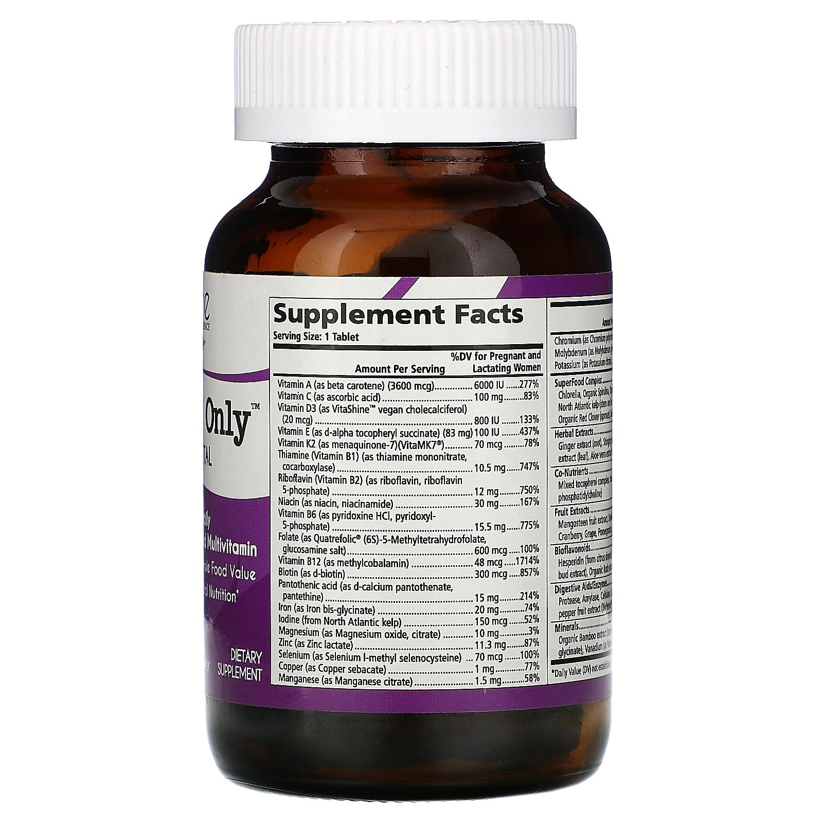 Serving Size: 1 tablet Amount Per Serving %DV for Pregnant and Lactating Women Vitamin A (as beta carotene) (3600 mcg) 6000 IU 277% Vitamin C (as ascorbic acid) 100 mg 83% Vitamin D3 (as Vitashine ™ vegan cholecalciferol)(20 mcg) 800 IU 133% Vitamin E (as d-alpha tocopheryl succinate) (83 mg) 100 IU 437% Vitamin K2 (as Menaquinone-7) (Vitamk7 ® ) 70 mcg 78% Thiamine (Vitamin B1) (as thiamine mononitrate, cocarboxylase) 10.5 mg 747% Riboflavin (Vitamin B2) (as riboflavin, riboflavin 5-phosphate) 12 mg 750% Niacin (as niacin, niacinamide) 30 mg 167% Vitamin B6 (as pyridoxine HCI, pyridoxal-5-phosphate) 15.5 mg 775% Folate (as Quatrefolic ® (6s)-5-methyltetrahydrofolate, glucosamine salt) 600 mcg 100% Vitamin B12 (as methylcobalamin) 48 mcg 1714% Biotin (as d-biotin) 300 mcg 857% Pantothenic Acid (as d-calcium pantothenate, pantethine) 15 mg 214% Iron (as bis-glycinate) 20 mg 74% Iodine (from North Atlantic kelp) 150 mcg 52% Magnesium (as Magnesium oxide, citrate) 10 mg 3% Zinc (as Zinc lactate) 11.3 mg 87% Selenium (as Selenium l-methyl Selenocysteine) 70 mcg 100% Copper (as Copper sebacate) 1 mg 77% Manganese (as Manganese citrate) 1.5 mg 58% Chromium (as Chromium polynicotinate) 120 mcg 267% Molybdenum (as Molybdenum glycinate) 75 mcg 150% Potassium (as Potassium Citrate) 10 mg <2% SuperFood Complex Chlorella, Organic Spirulina, Organic Oat Grass juice extract, Organic North Atlantic kelp (stem and leaf), Organic Quinoa (sprouts), Organic Red Clover (sprouts), Sodium copper chlorophyllin 545 mg * Herbal Extracts Ginger extract (root), Stinging nettle extract (leaf), Raspberry extract (leaf), Aloe vera extract (leaf) 200 mg * Co-Nutrients Mixed Tocopherol Complex, Inositol, Sunflower lecithin (source of phosphatidylcholine) 65 mg * Fruit Extracts Mangosteen fruit extract, Strawberry, Blueberry, Blackberry, Cranberry, Grape, Pomegranate and Acerola cherry fruit extract 40 mg * Bioflavonoids Hesperidin (from citrus sinensis), Quercetin (from Japanese Sophora bud extract), Rutin extract (from Sophora japonica L. bud) 30 mg * Digestive Aids/Enzymes Protease, Amylase, Cellulase, Lactase, Lipase, Invertase, Black pepper fruit extract (BioPerine ® ) 17 mg * Minerals Bamboo extract (stem and leaf), Boron (as Boron glycinate), Vanadium (as Vanadium glycinate) 10.5 mg * *Daily Value (DV) not established.Disclaimer
