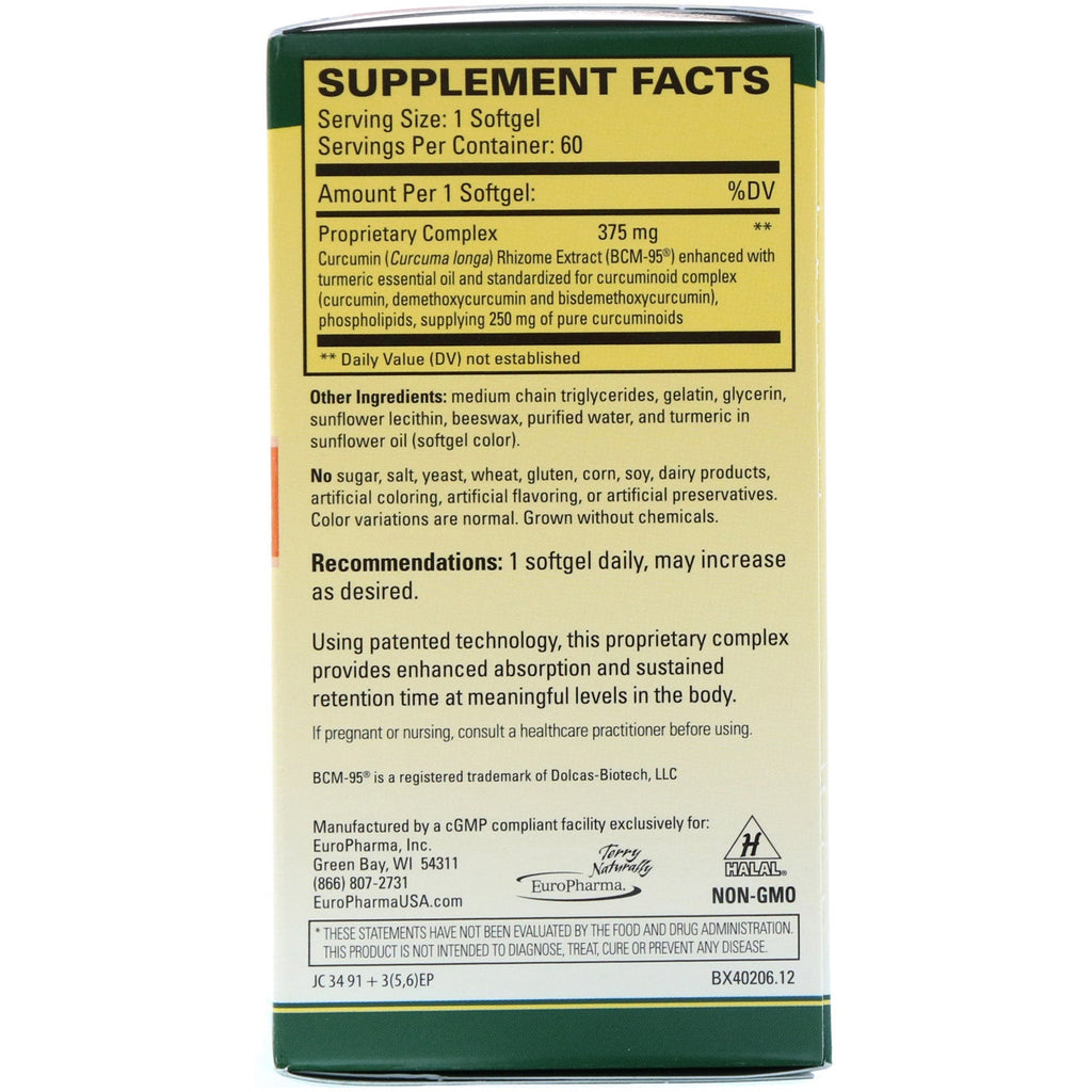 Serving Size: 1 Softgel Servings per Container: 60 Amount Per 1 Softgel %DV Proprietary Complex Curcumin (Curcuma longa) Rhizome Extract (BCM-95) enhanced with turmeric essential oil and standardized for curcuminoid complex (curcumin, demethoxycurcumin and bisdemethoxycurcumin), phospholipids, supplying 250 mg of pure curcuminoids 375 mg ** **Daily Value (DV) not established.Disclaimer
