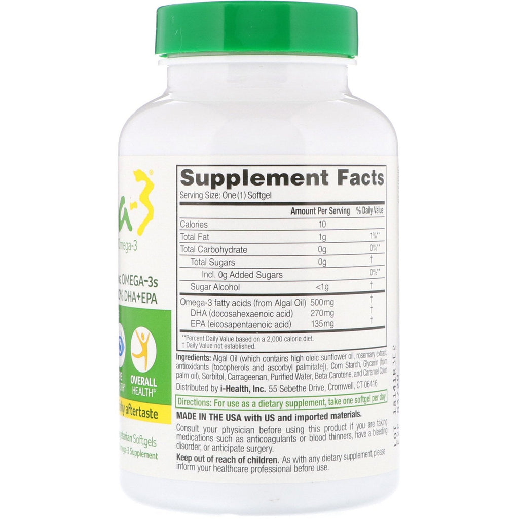 Plant-Based Omega-3 500 mg Omega-3s >80% DHA + EPA No Fish = No Fishy Aftertaste Only 1 Per Day! Omega-3 Supplement Powered by Life's Omega Supports Heart Health Brain Health Eye Health Overall Health Ovega-3 is an all-vegetarian/vegan DHA+EPA Omega-3 supplement from a safe and naturally sourced plant (algae); not fish. Ovega-3 contains 500 mg of Omega-3s in every softgel, higher than most high concentration Krill Oil options in the market†. And because Ovega-3 contains DHA+EPA Omega-3s (not found in flax or chia seed oils), it provides a true vegetarian alternative to Fish Oil. Ovega-3 is GMO-Free, gluten-free‡‡, soy-free, lactose-free and sugar-free‡. †vs. leading krill oil brand based on Nielsen data. ‡Not a reduced calorie food. ‡‡Meets the FDA's guidelines for gluten-free.Sugg. UseFor use as a dietary supplement, take one softgel per day.Other IngredientsAlgal oil (which contains high oleic sunflower oil, rosemary extract, antioxidants [tocopherols and ascorbyl palmitate]), corn starch,...