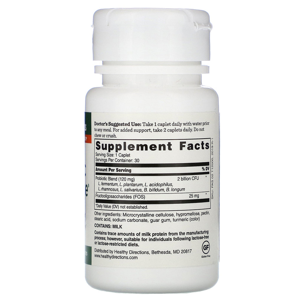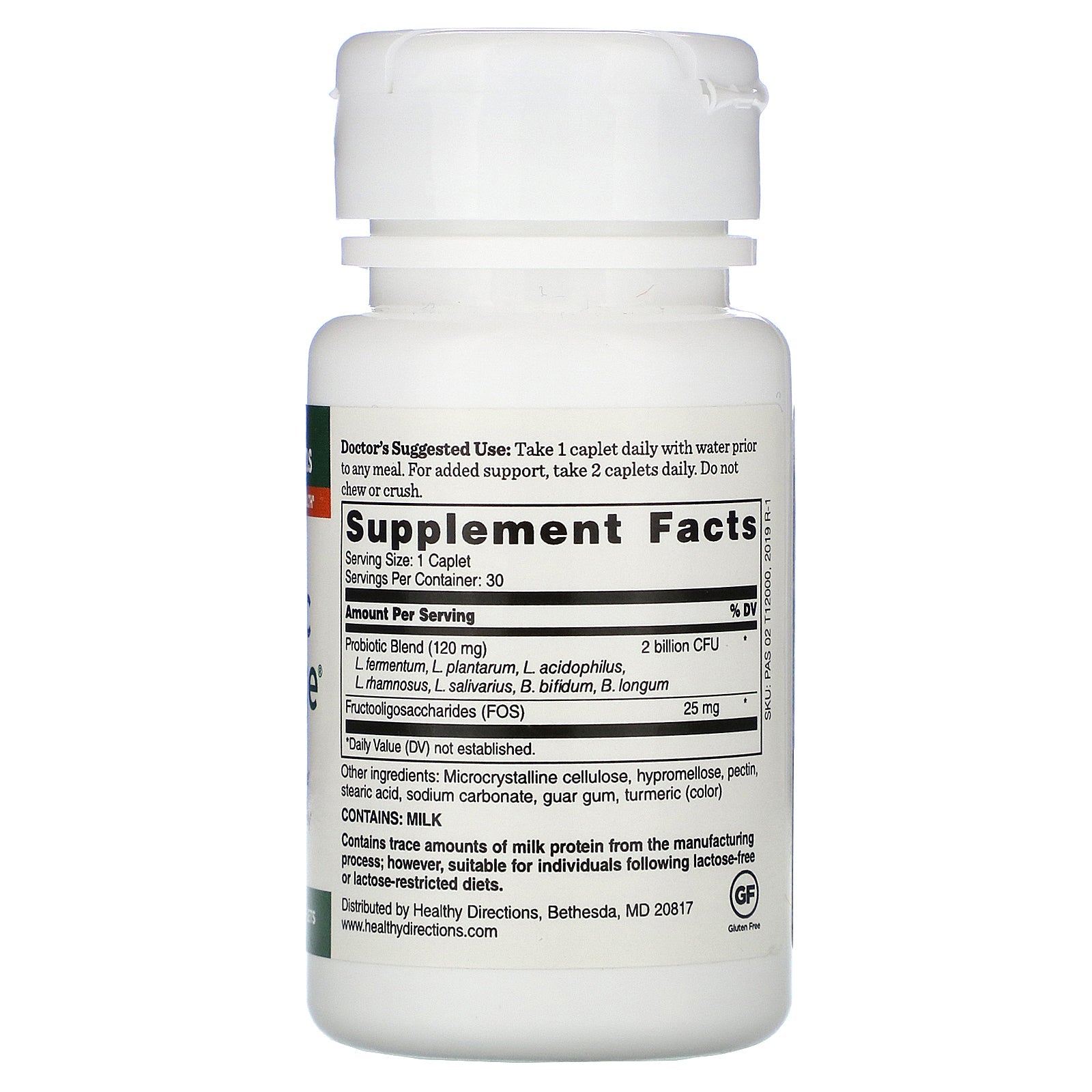 Searching the World for Better Health® Supports Healthy Digestive Balance Deliver 2 Billion Probiotic Cells Daily Dietary Supplement Gluten FreeSugg. UseTake 1 capelet daily with water prior to any meal. For added support, take 2 caplets daily. Do not chew or crush.Other IngredientsMicrocrystalline cellulose, hypromellose, pectin, stearic acid, sodium carbonate, guar gum, turmeric (color). Contains: Milk. Contains trace amount of milk protein from the manufacturing process; however suitable for individuals following lactose-free or lactose-restricted diets.Supplement FactsServing Size: 1 Caplet Serving Per Container: 30 Amount Per Serving %Daily Value Probiotic Blend (120 mg) L. fermentum, L. plantarum, L. acidophilus, L. rhamnosus, L. salivarius, B. bifidum, B. longum 2 billion CFU * Fructooligosaccharides (FOS) 25 mg * *Daily Value (DV) not established.DisclaimerWhile VitaminsUK strives to ensure the accuracy of its product images and information, some manufacturing changes to packaging and/or ingredients may be pending update on our site. Although items may occasionally...
