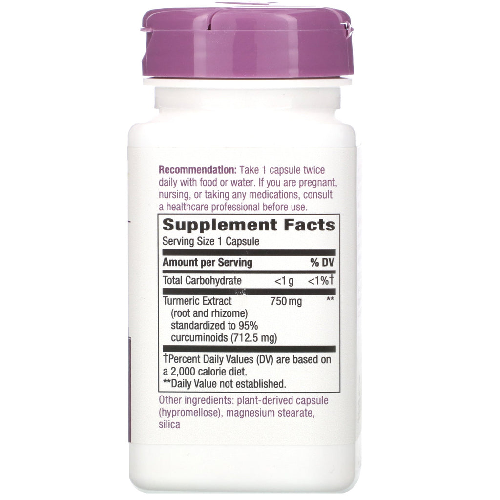 Since 1969 Premium Extract Supports Joint Health Max Potency Certified Authentic TRU-ID™ Non GMO Project Verified 750 mg Per Serving Dietary Supplement Vegan Supports Joint Health Turmeric has been used in Ayurvedic culture for thousands of years. The root grows in tropical areas of Southern Asia, most commonly, India. Turmeric is related to ginger root, but is clearly distinguished by it's bright orange color. The active constituents in turmeric are called curcuminoids which help support joint health. Nature's Way® standardizes our Turmeric to 95% curcuminoids to ensure you're getting the best the root has to offer. ‡As compared to 500 mg potency.Sugg. UseTake 1 capsule twice daily with food or water.Other IngredientsPlant-derived capsule (hypromellose), magnesium stearate, silica. Gluten free. No sugar, salt, soy, yeast, wheat, dairy products, or artificial colors, flavors or preservatives.Supplement FactsServing Size: 1 Capsule Amount Per Serving % Daily Value Total Carbohydrate < 1 g < 1%†...